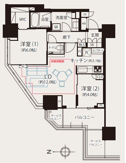 | 間取 | 2LDK (LD12.0帖、K3.1帖、洋室6.0帖、洋室4.0帖) | ||