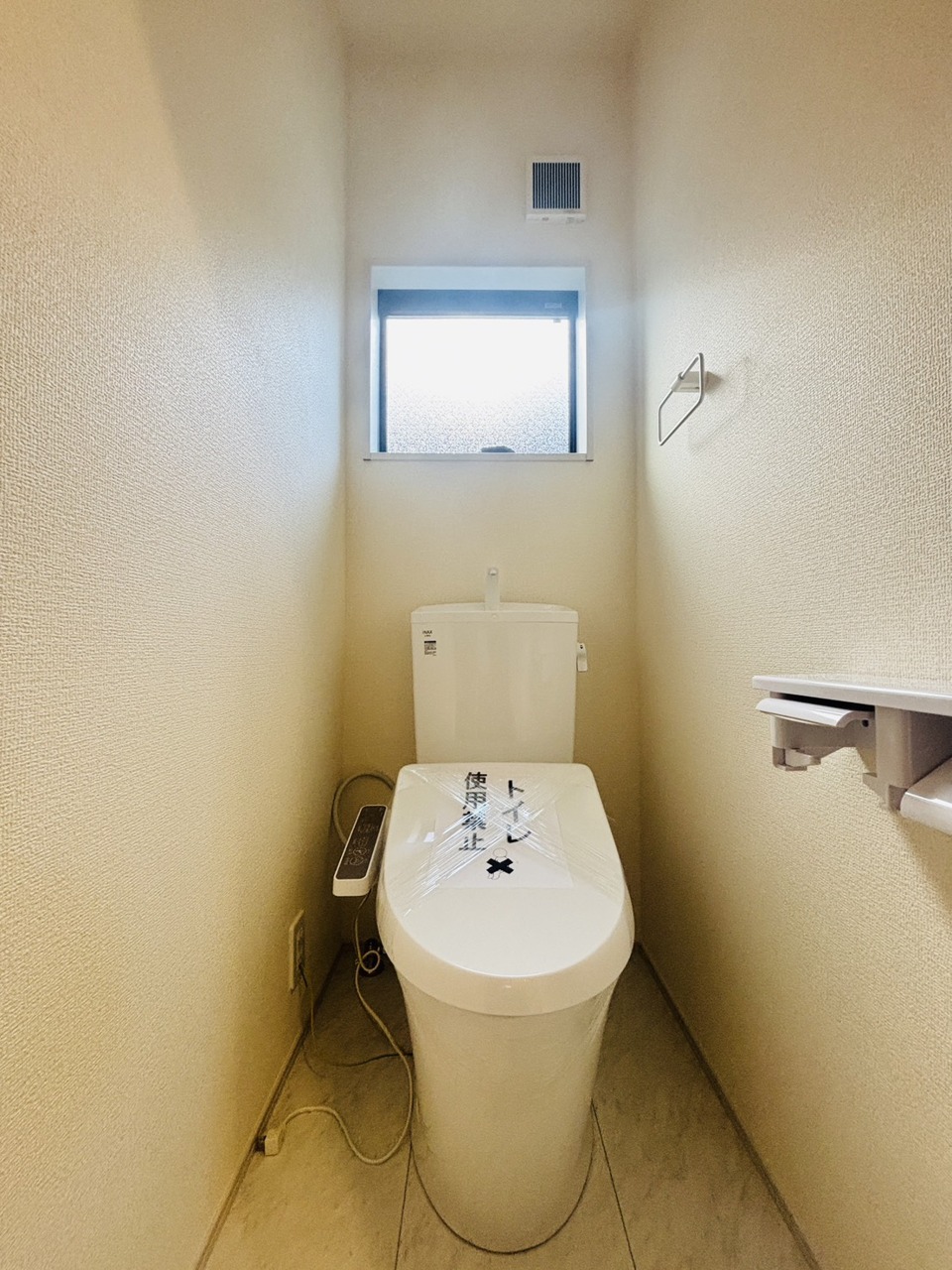 ウォシュレット機能付きのトイレ。換気のしやすい窓付きで、収納もあり実用性も兼ね備えた造り。