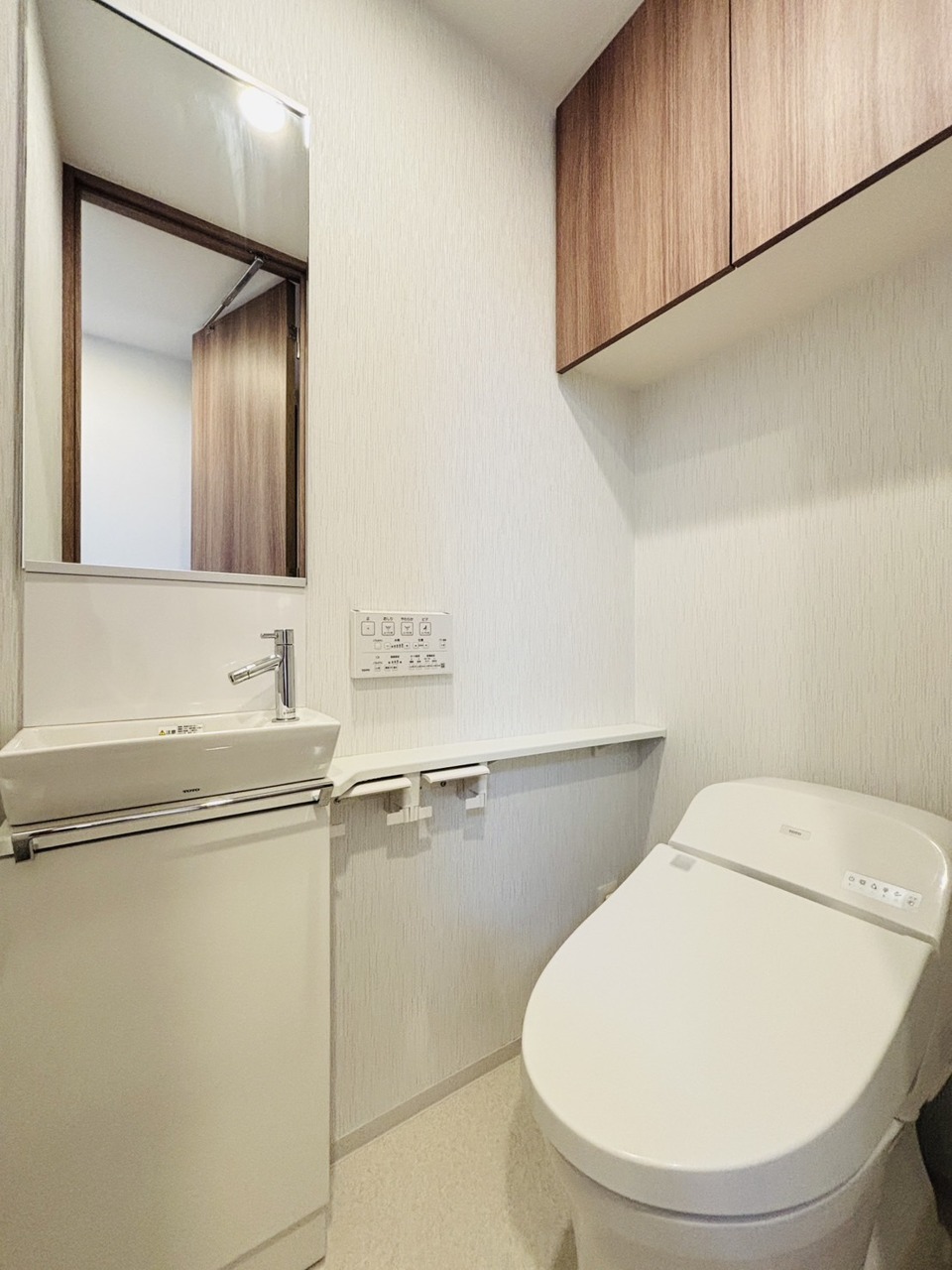 ウォシュレット機能付きのトイレ。収納もあり実用性も兼ね備えた造り。