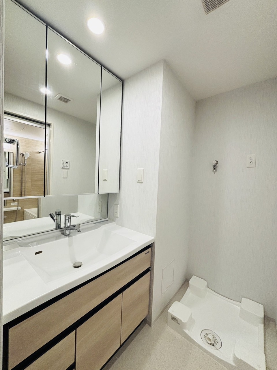 お出かけ前の身だしなみに一歩差がつく三面鏡。ミラー裏にはたっぷり収納もございます。