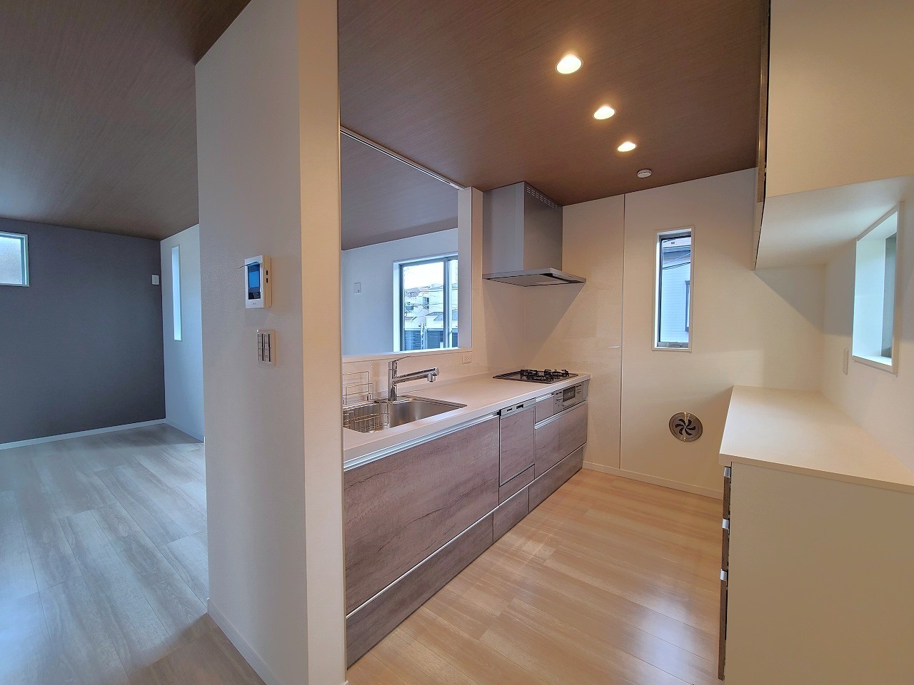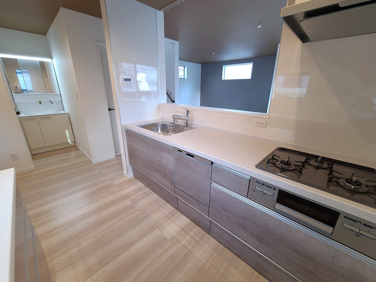 リビングにいる家族の顔が見渡せるカウンターキッチン。お料理もより一層おいしく、楽しく。食器棚を背面に設置しても十分な広さを確保しています。