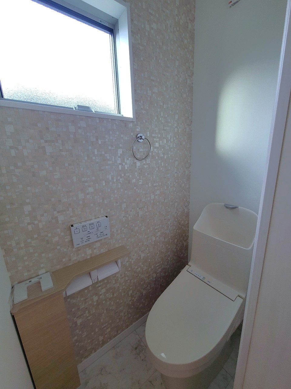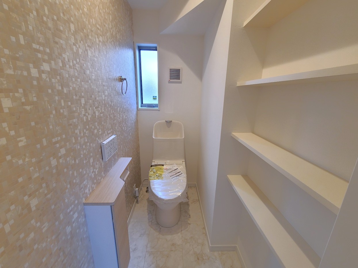 ウォシュレット機能付きのトイレ。換気のしやすい窓付きで、収納もあり実用性も兼ね備えた造り。
