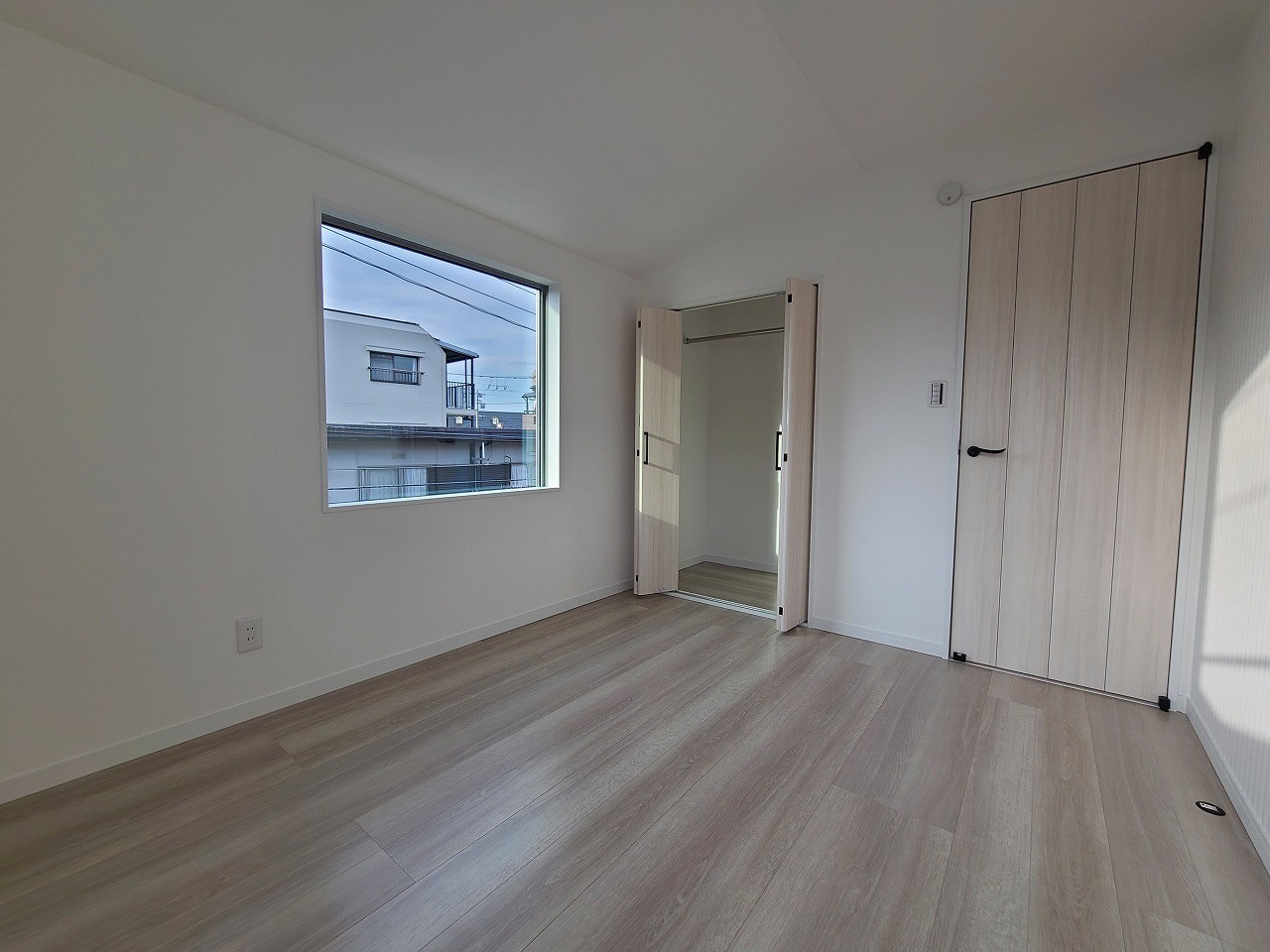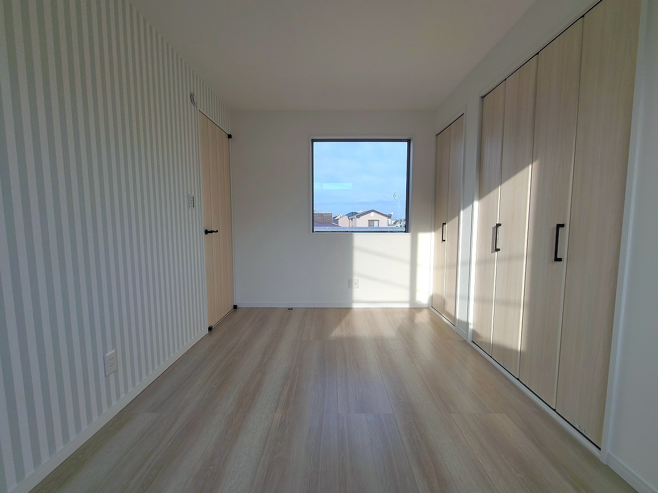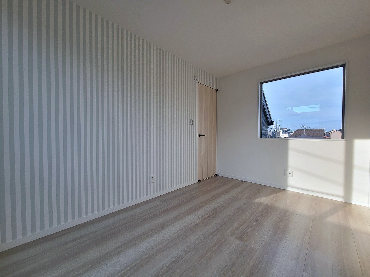 アクセントクロスを使用したオシャレな洋室。窓からそそぐ陽の光が眩しいベッドルームは、朝の目覚めが心地良く迎えられそうです。