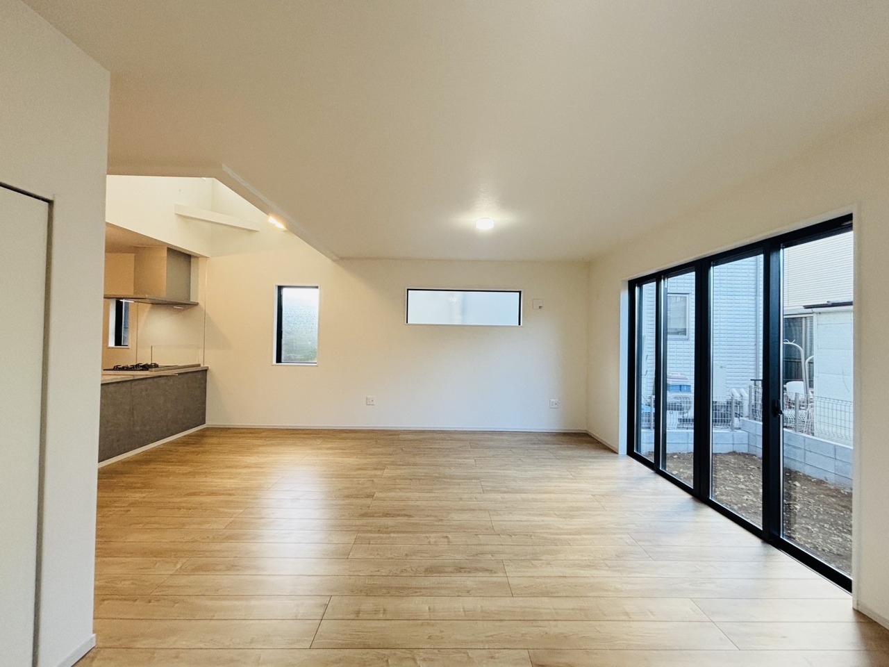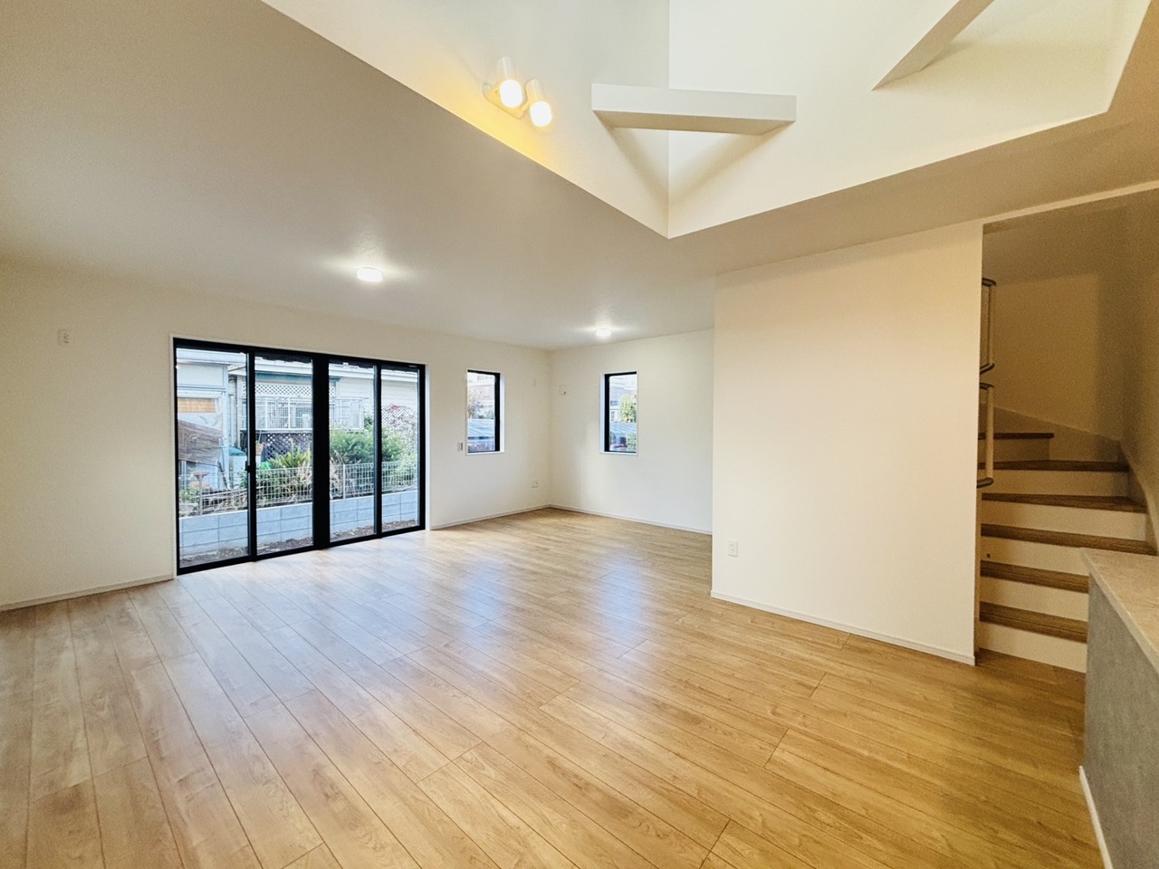 大きな開口部から明るい光が差し込む、日中の室内の明るさがこの部屋の魅力です。