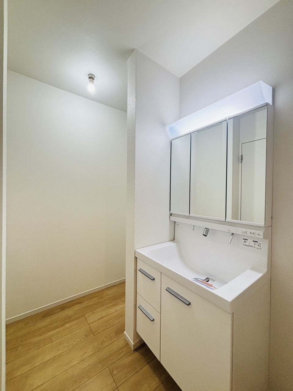 お出かけ前の身だしなみに一歩差がつく三面鏡。ミラー裏にはたっぷり収納もございます。