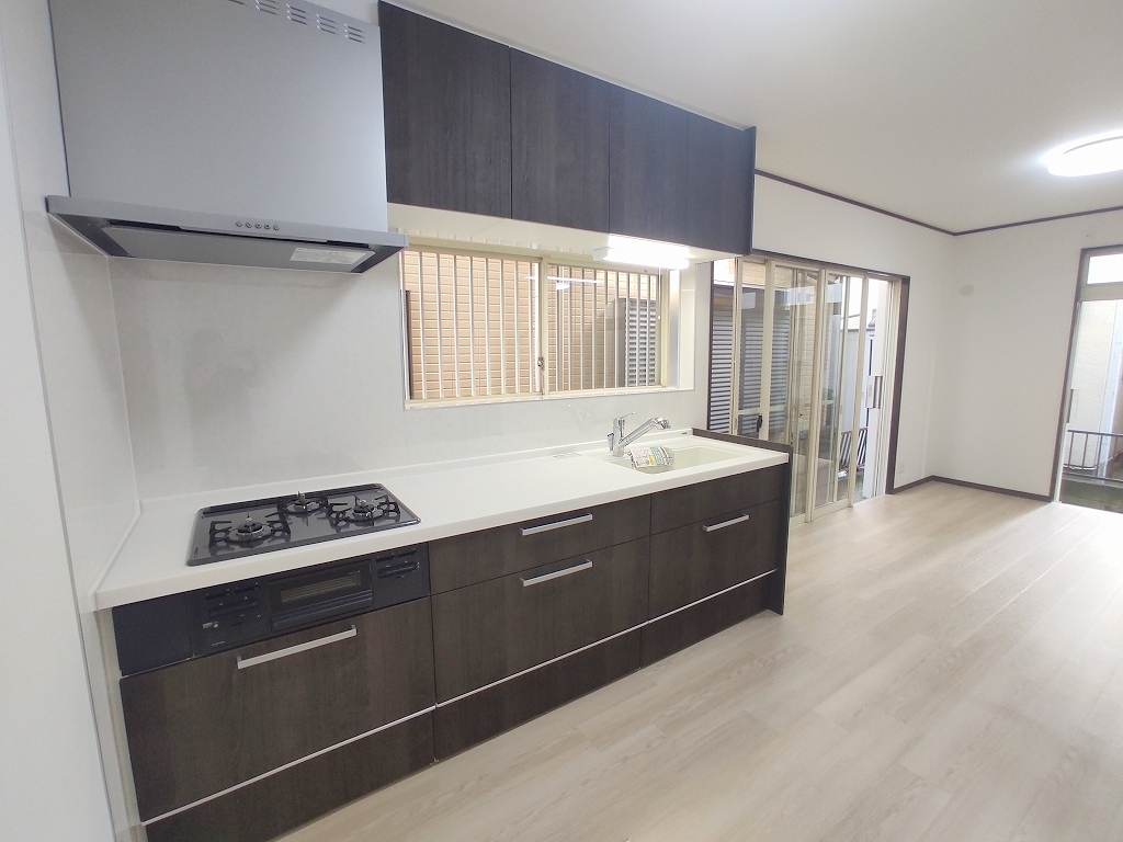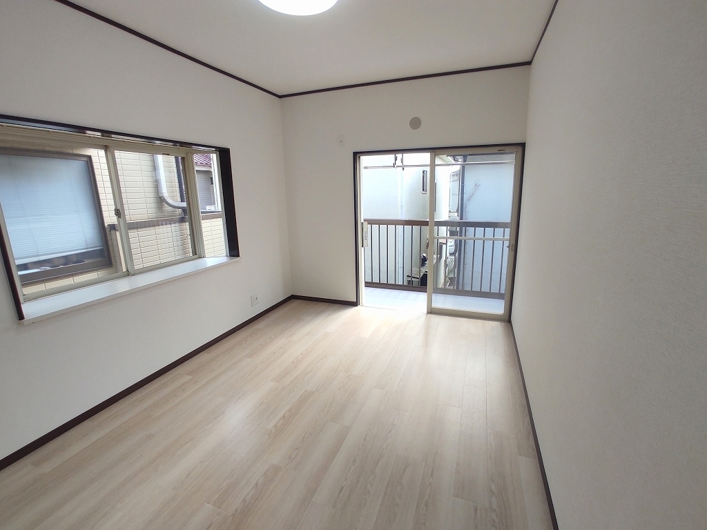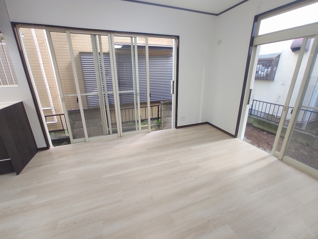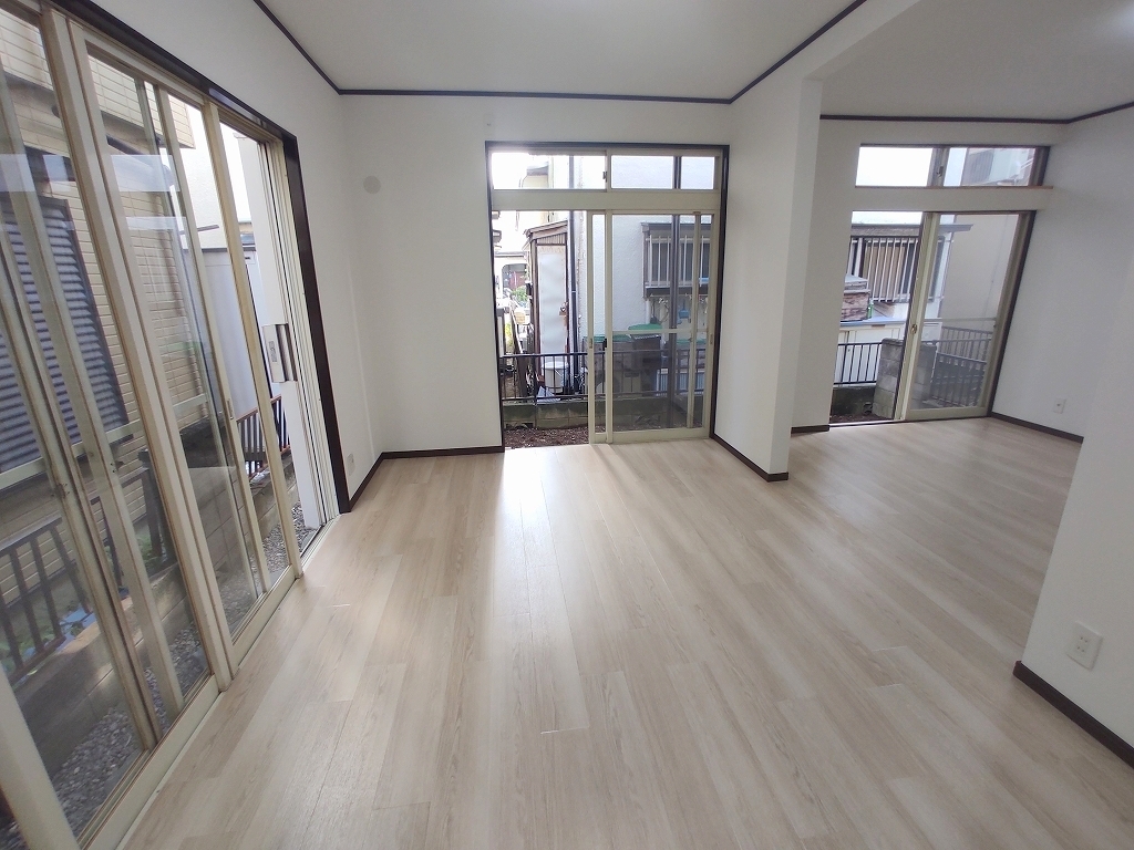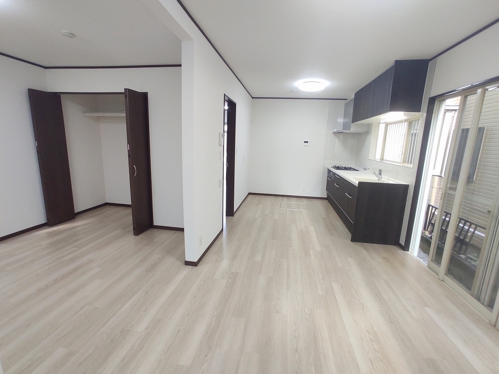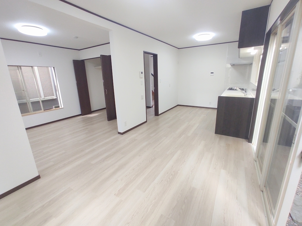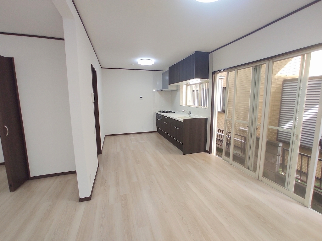 大きな窓から吹き込む風は心地よいですね。キッチン、床材、クロスが新品に交換済み。中古ながらも築年数を感じさせません。
