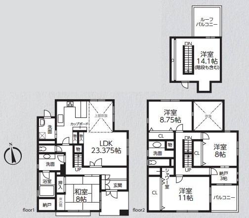 | 間取 | 5LDK + 1FLDK23.3×1・和8×1・2F洋11×1・洋8.7×1・洋8×1 | ||