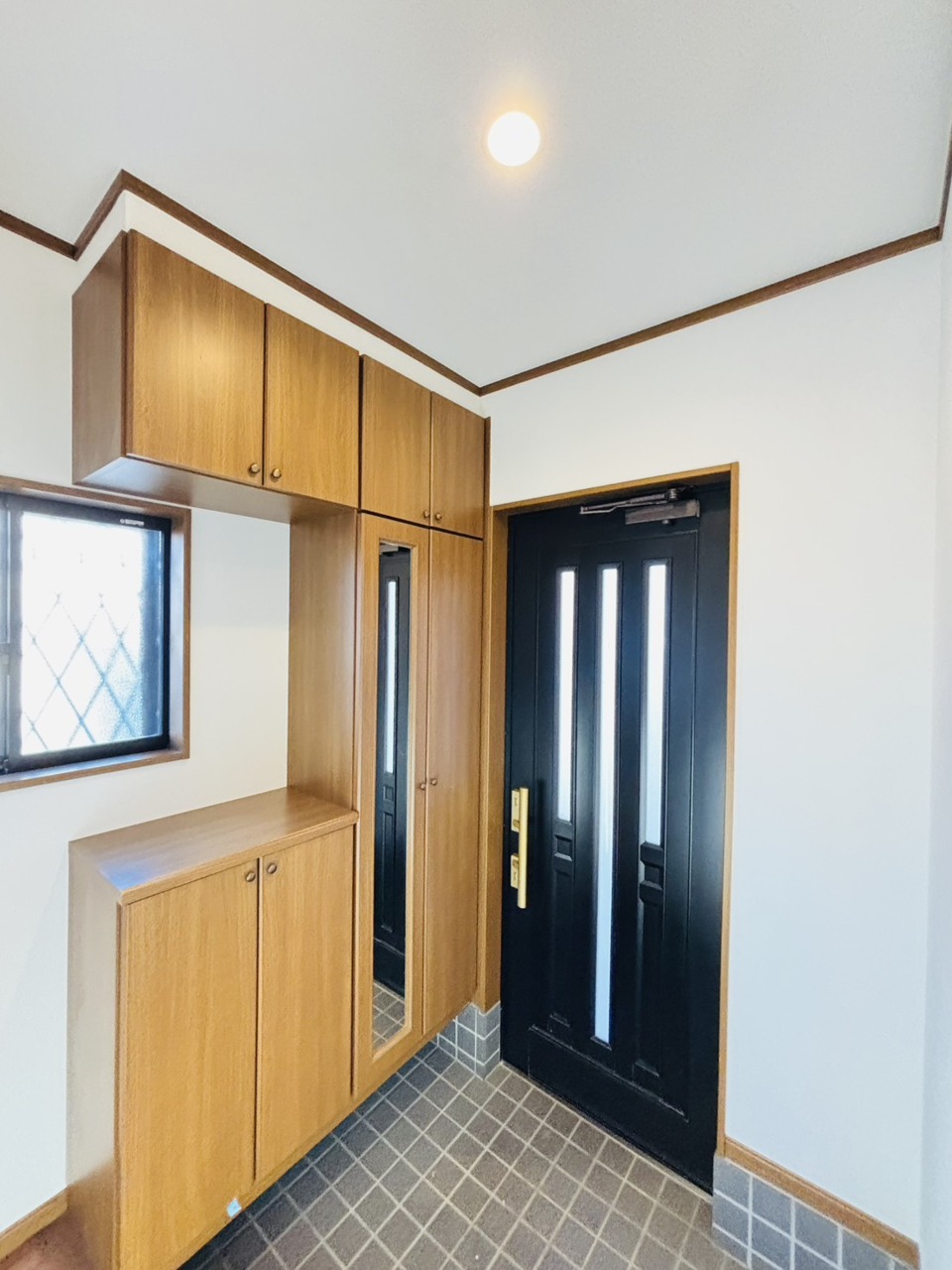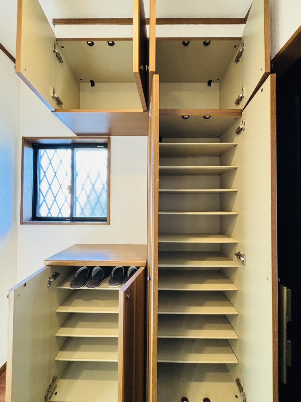 収納と窓のある機能的な玄関。