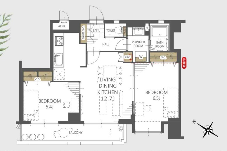 | 間取 | 2LDK (LDK12.7帖、洋室6.5帖、洋室5.4帖) | ||