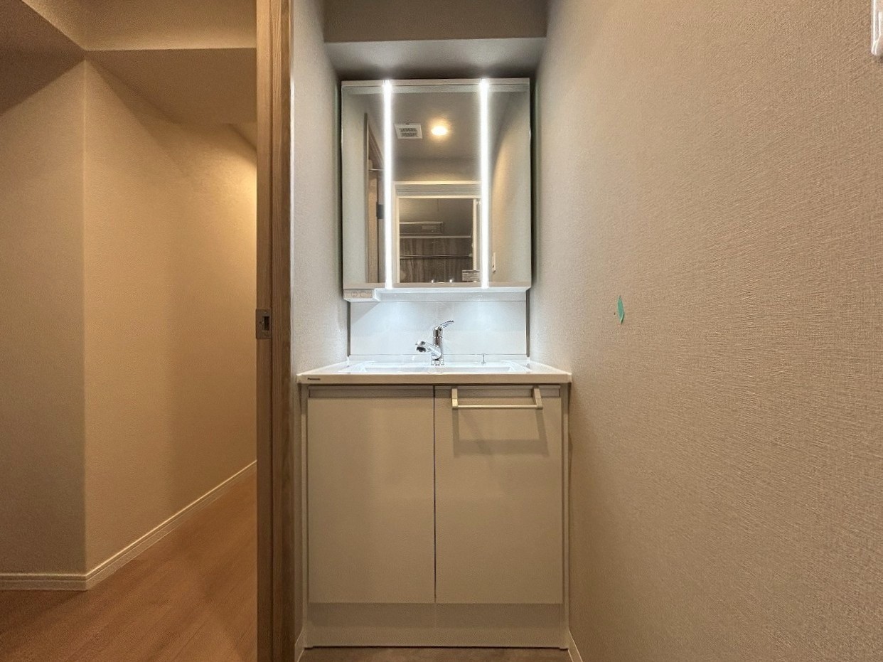 三面鏡を採用した洗面化粧台。鏡の裏にも収納スペースがあります。