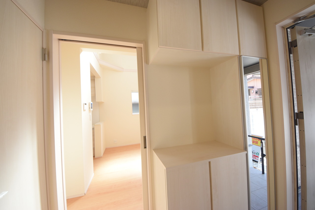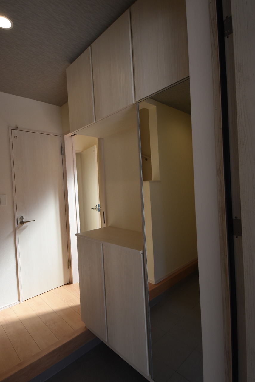お宅の顔となる明るく開放的な玄関。ご家族皆様様の靴を収納できるスペースと全身鏡があり、お出掛け前に身だしなみチェックもできます。