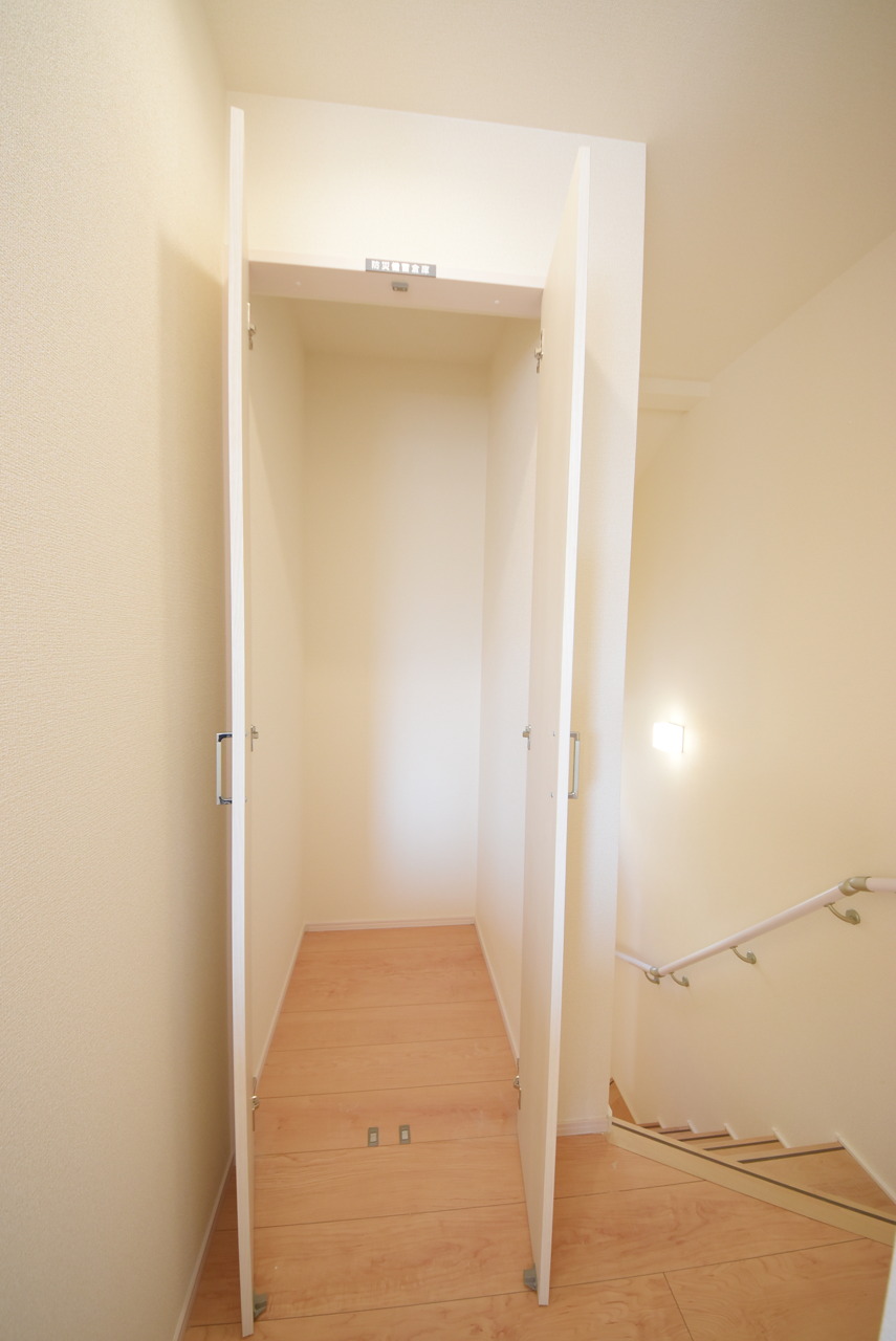 収納豊富な間取りで家の中がスッキリ片付きそうです。 リビング中央にある備蓄倉庫