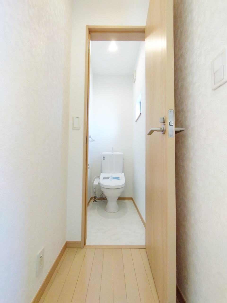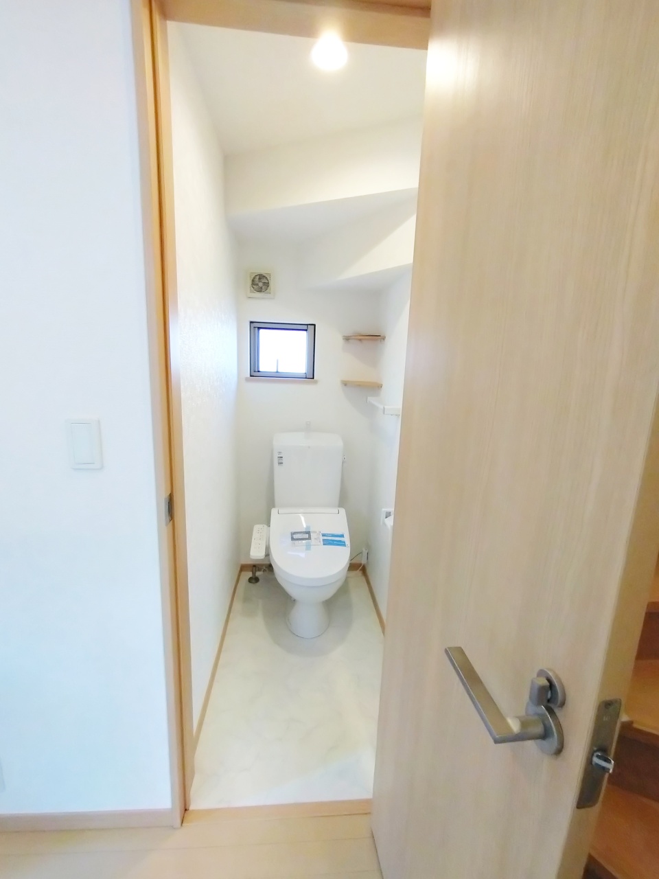 ウォシュレット機能付きのトイレ。換気のしやすい窓付きで、収納もあり実用性も兼ね備えた造り。