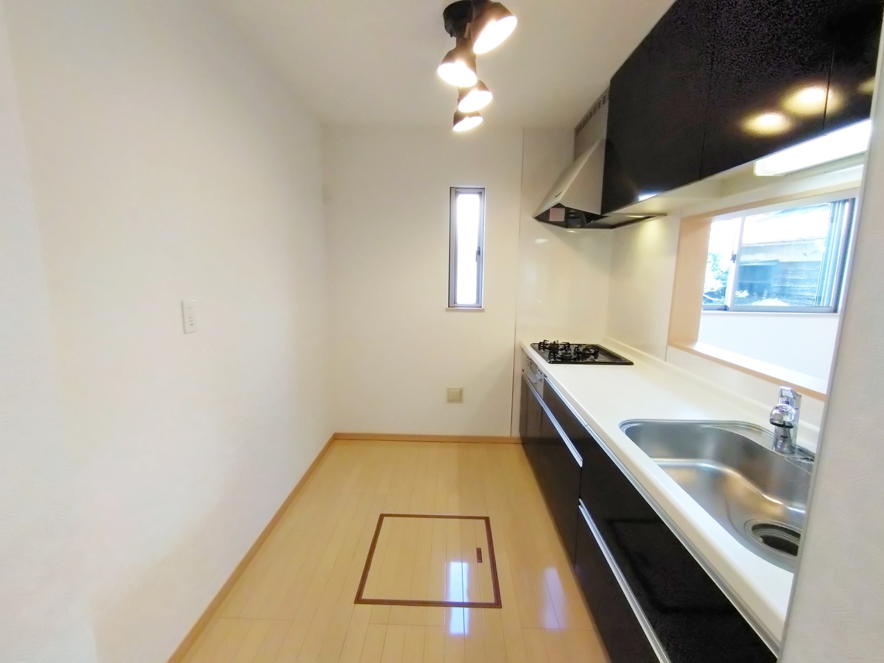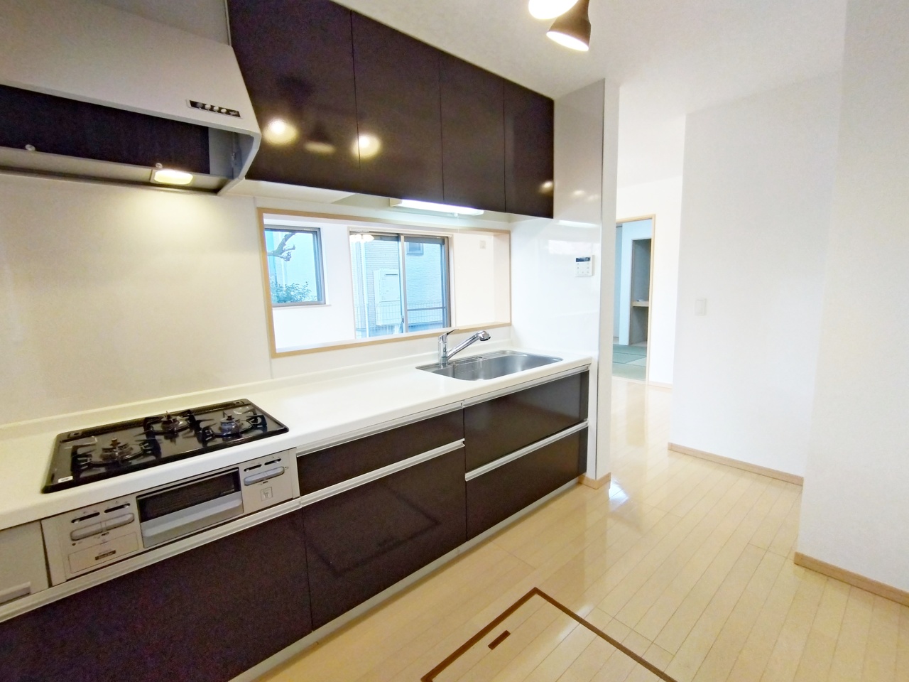 リビングにいる家族の顔が見渡せるカウンターキッチン。お料理もより一層おいしく、楽しく。食器棚を背面に設置しても十分な広さを確保しています。
