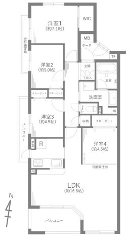 | 間取 | 4LDK (LDK16.8帖、洋室7.1帖、洋室5.0帖、洋室4.5帖、洋室4.5帖) | ||