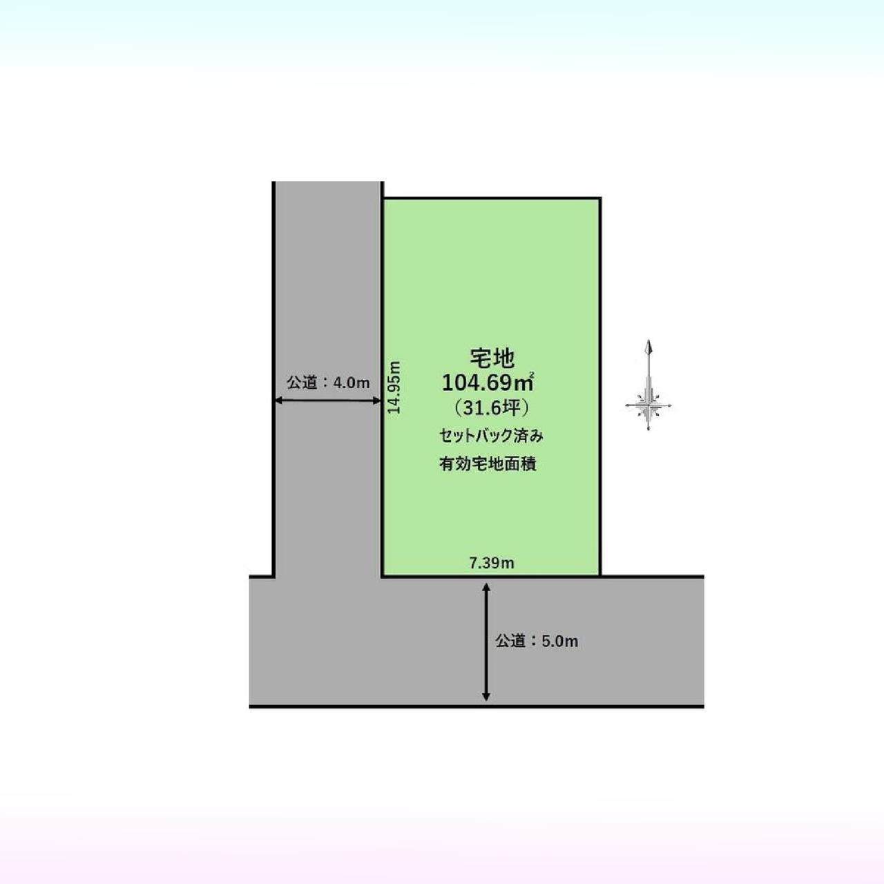 | 土地面積 | 104.69m² 実測 (私道9.54m²別に有、セットバック9.54m²) | ||