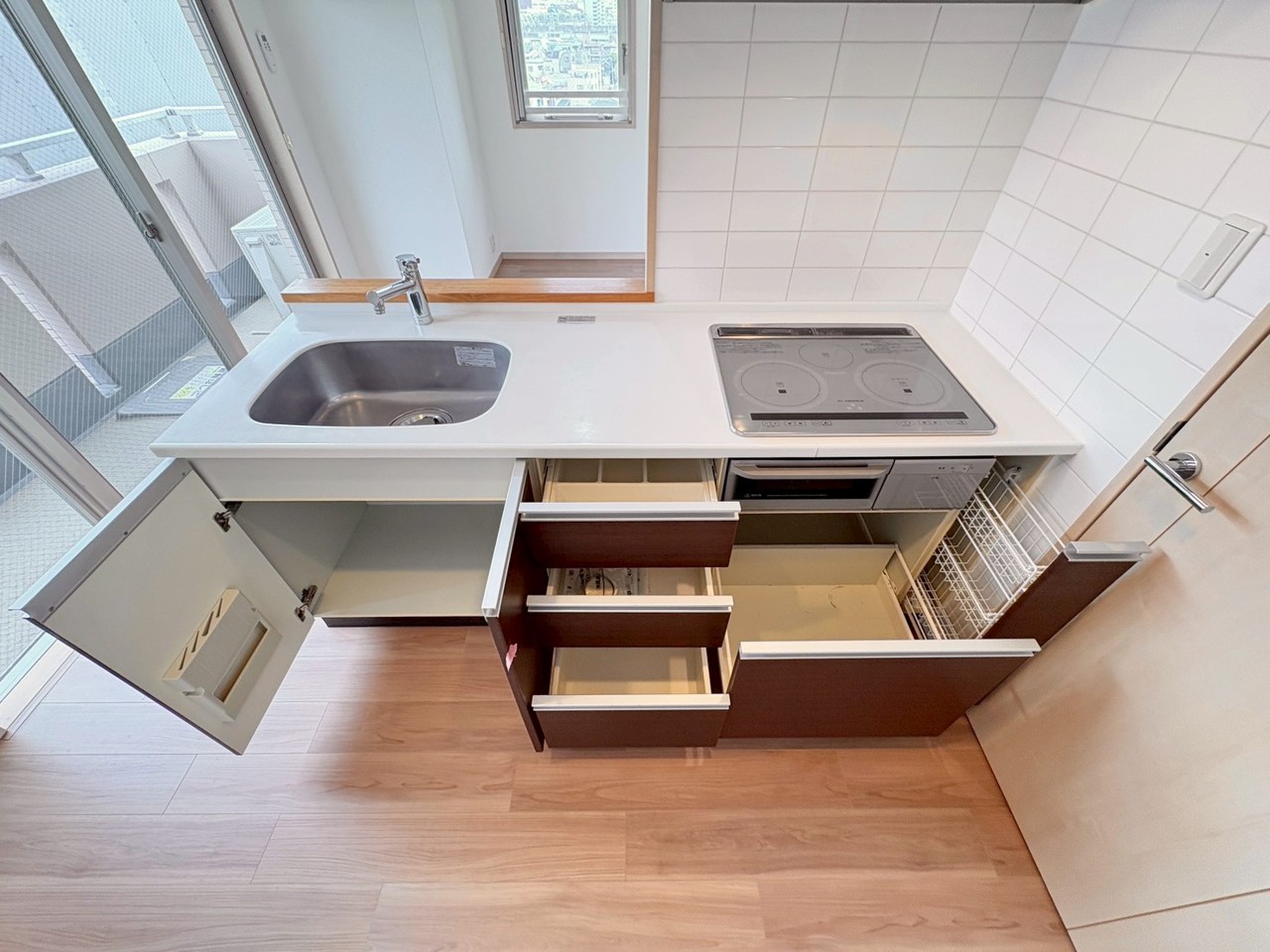 収納スライドをぐっと開けばお鍋や調味料をどんどんしまえる大収納。キッチンはいつもキレイ。