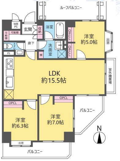 | 間取 | 3LDK (LDK15.5帖、洋室7.0帖、洋室6.3帖、洋室5.0帖) | ||
