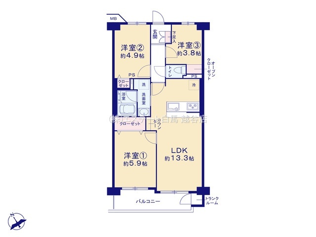 | 間取 | 3LDK (LDK13.3帖、洋室5.9帖、洋室4.9帖、洋室3.8帖) | ||