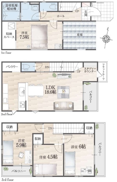 | 間取 | 4LDK (LDK18.6帖、洋室7.5帖、洋室6帖、洋室5.9帖、洋室4.5帖) | ||