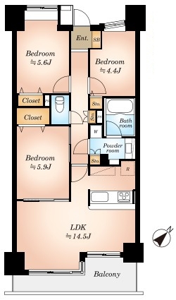 | 間取 | 3LDK (LDK14.5帖、洋室5.9帖、洋室5.6帖、洋室4.4帖) | ||