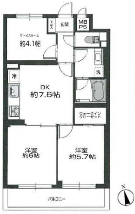 | 間取 | 3DK (洋室6帖、洋室5.7帖、S4.1帖、DK7.6帖) | ||
