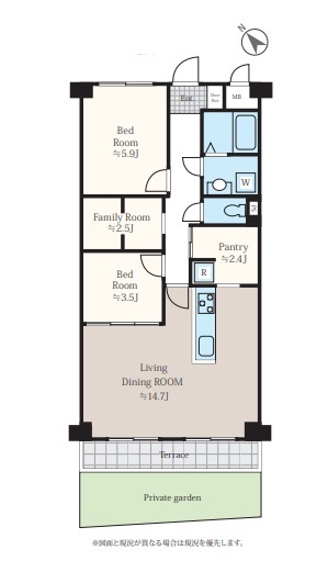| 間取 | 2LDK + ファミリールーム:2.5帖 パントリー:2.4帖 (LDK14.7帖、洋室5.9帖、洋室3.5帖) | ||