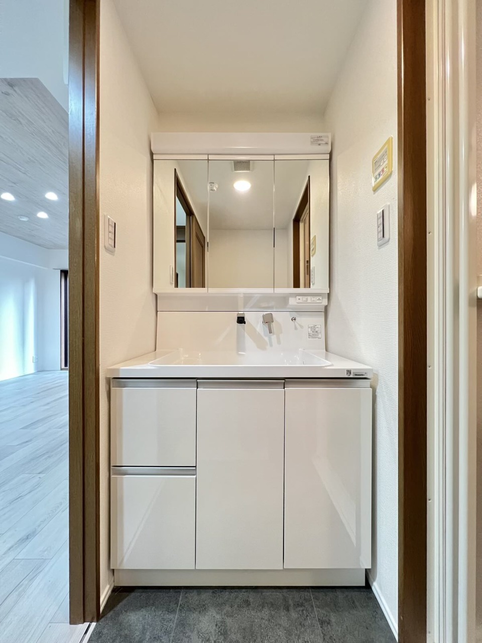 収納豊富な三面鏡付洗面化粧台。水回りのあれこれがキレイに収まりそうですね。