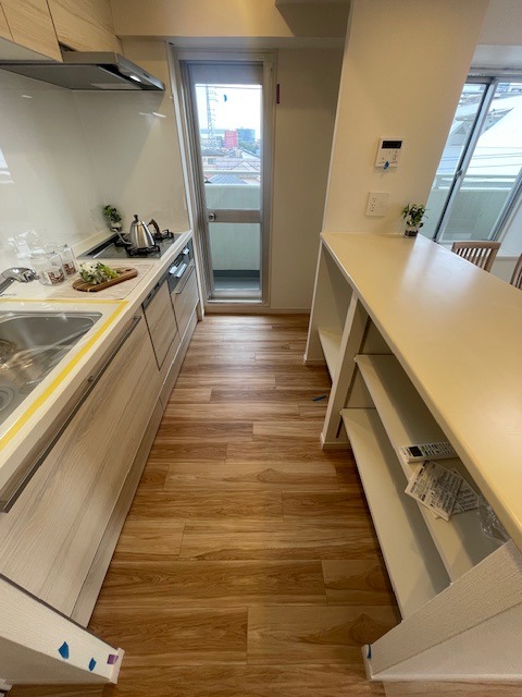 盛り付け台に朝ごはんに、便利なカウンター付き。勝手口もあるのでキッチンから出たゴミをサッと外へ。キッチンはいつも清潔キレイ。