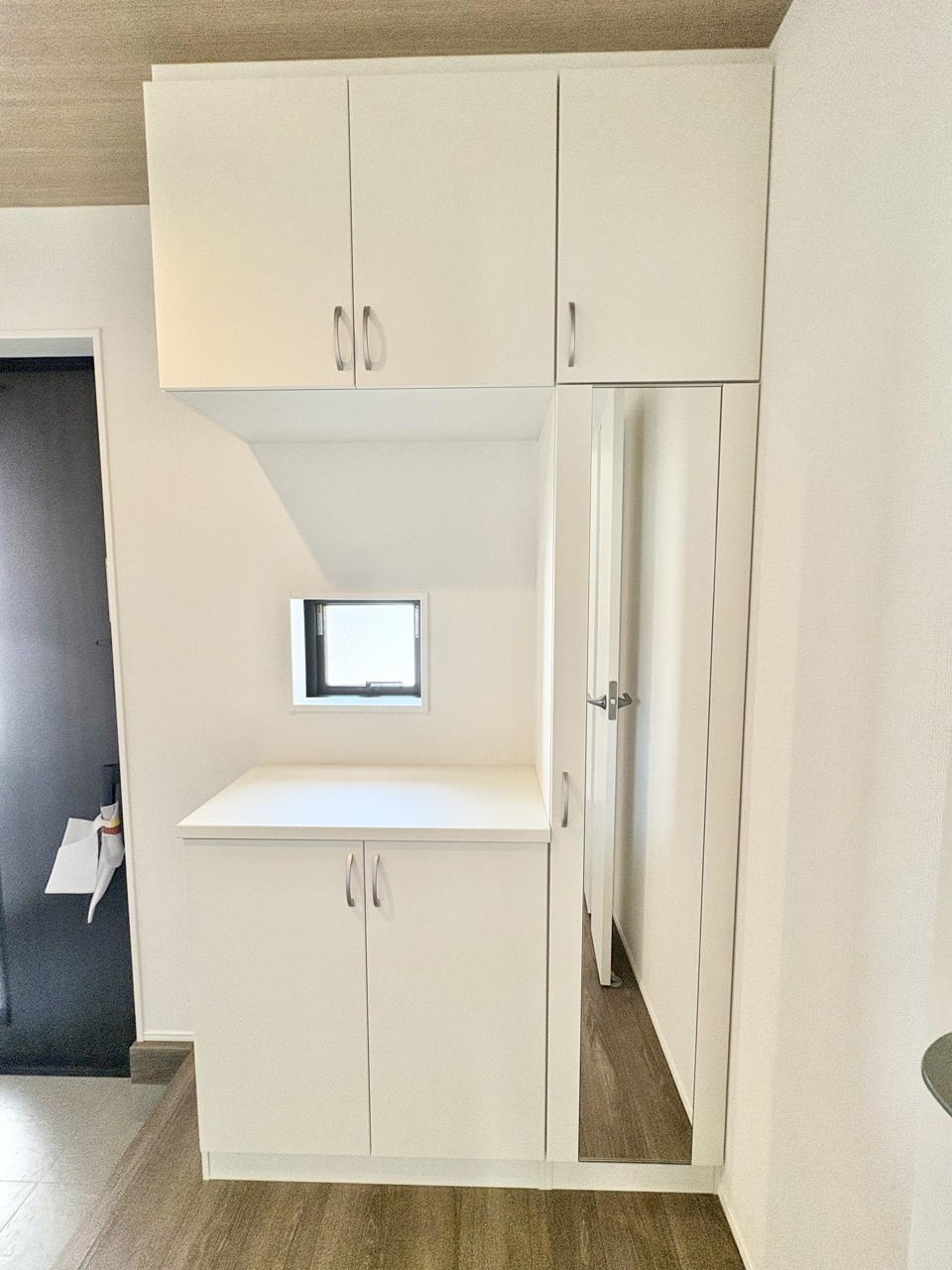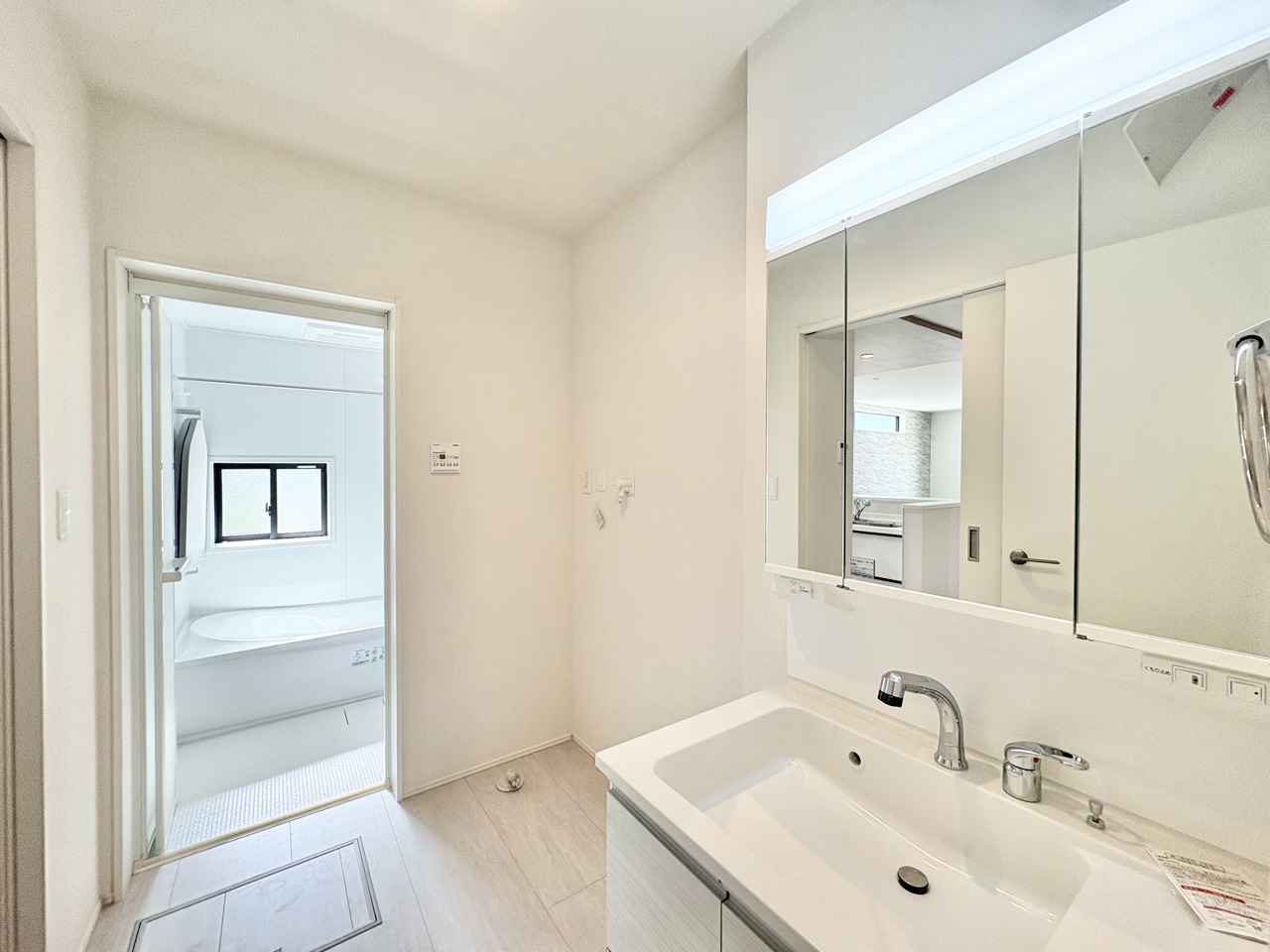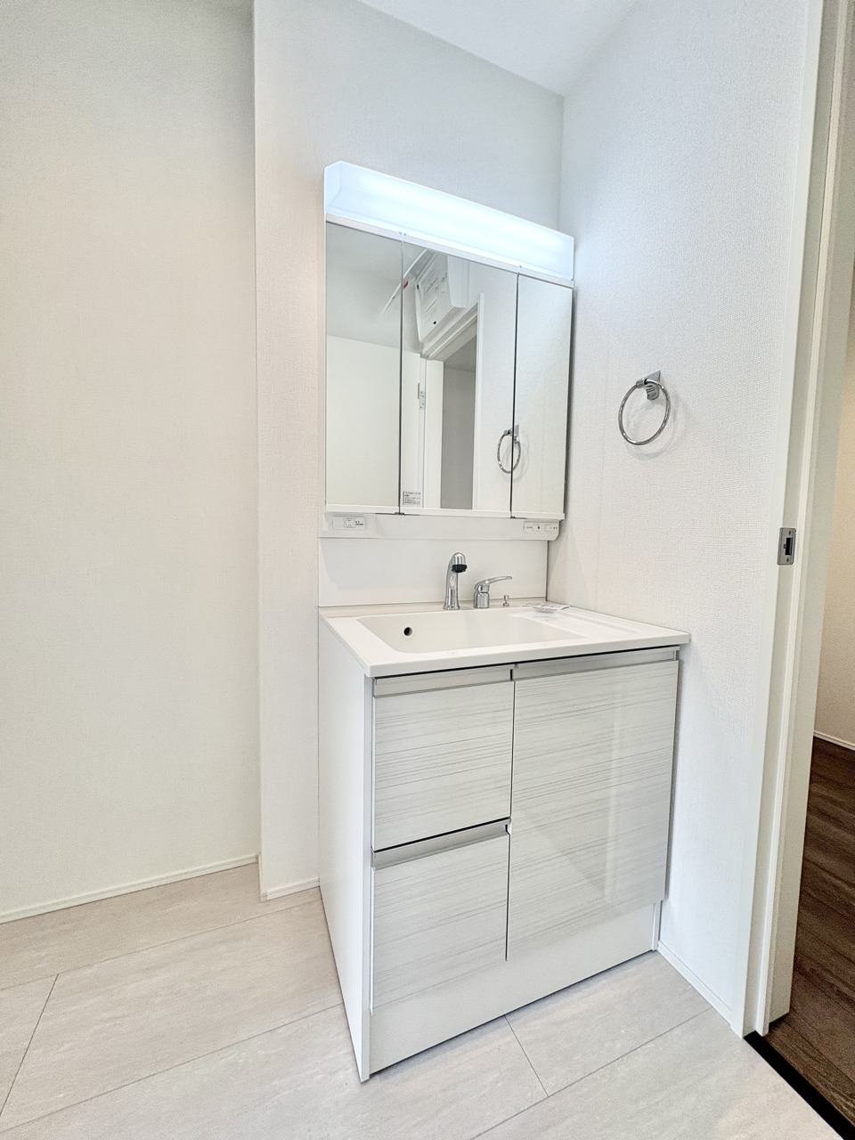 清潔感あふれる空間に、すっきりとした収納と鏡のアクセント。