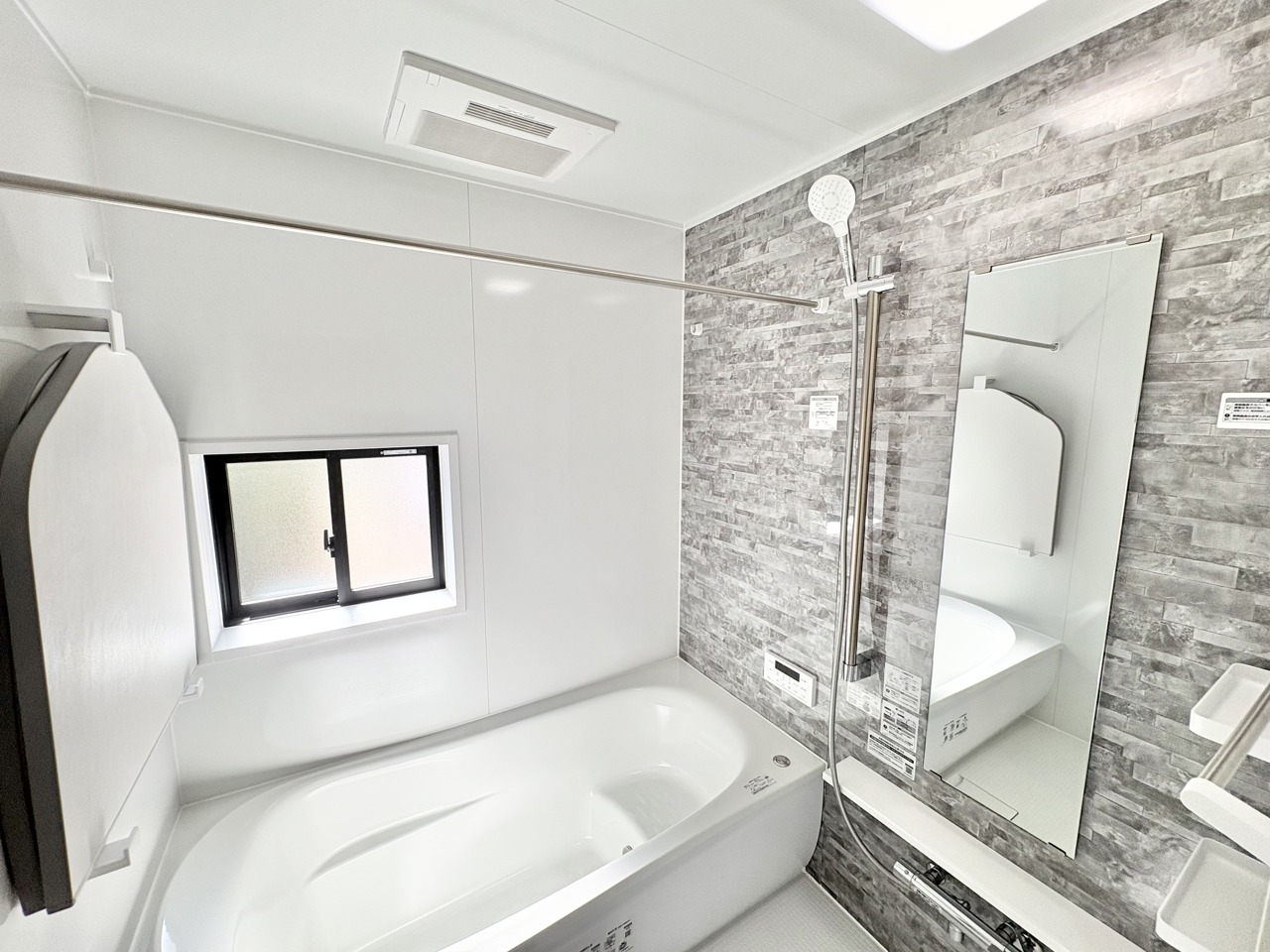 清潔感あふれる空間に、落ち着いた石調の壁がおしゃれなアクセント。