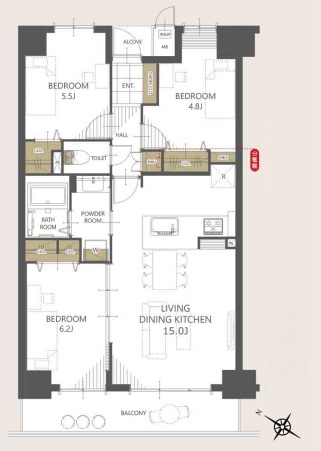 | 間取 | 3LDK + アルコープあり1.00平米 (LDK15.0帖、洋室6.2帖、洋室5.5帖、洋室4.8帖) | ||
