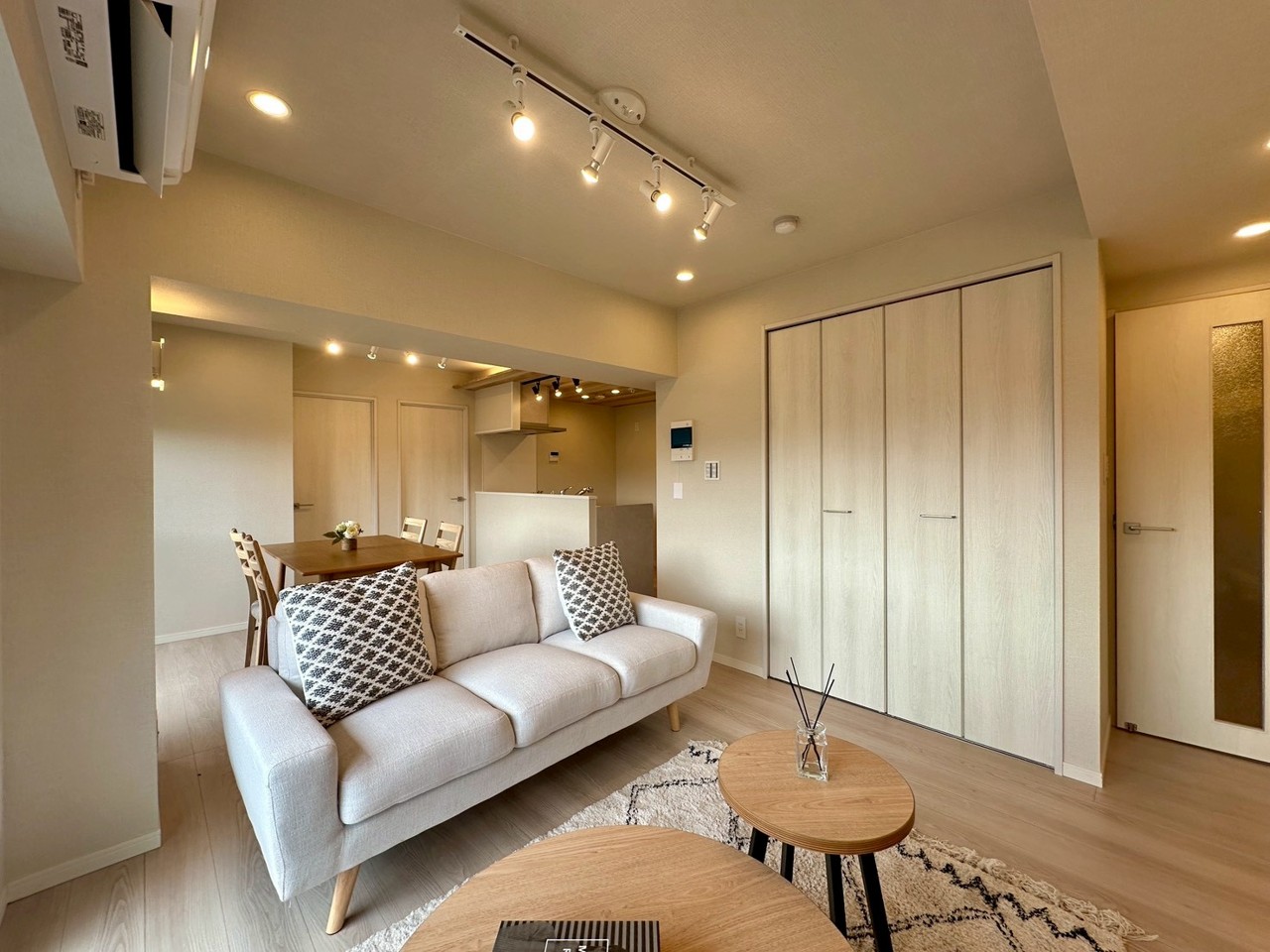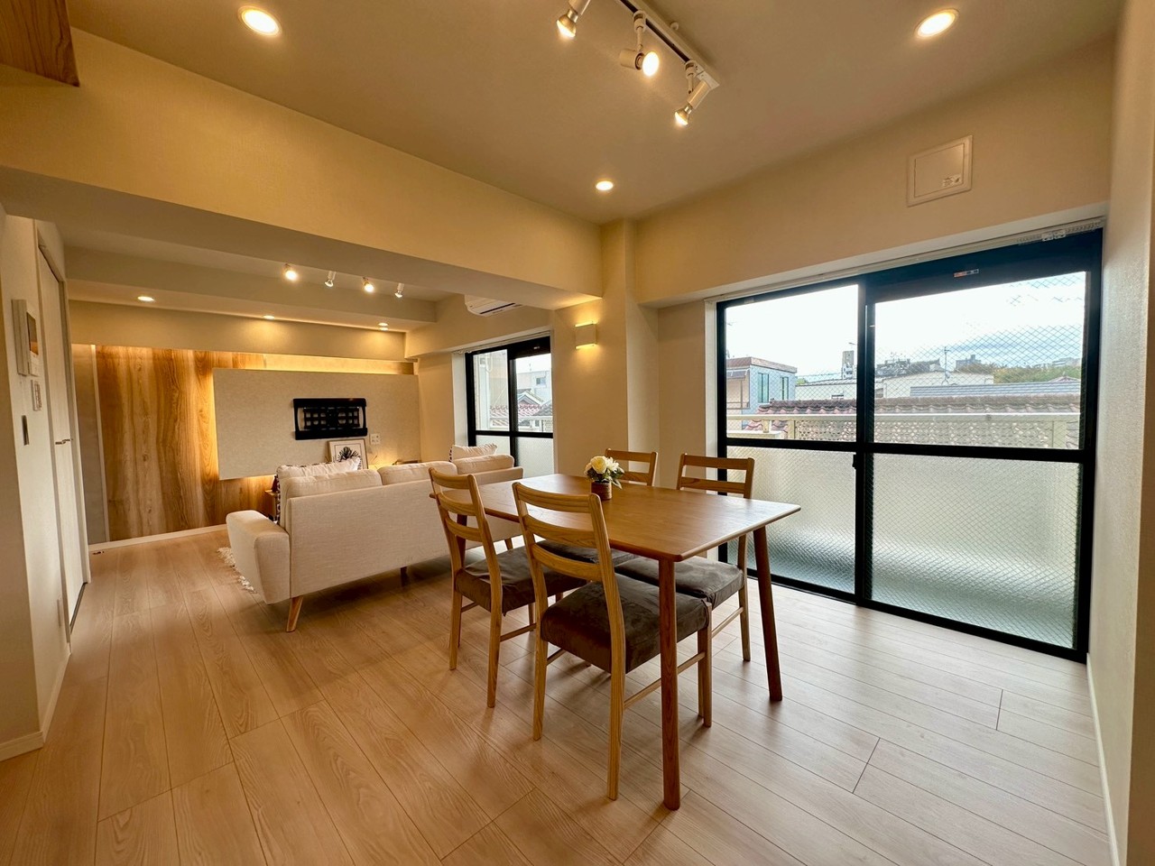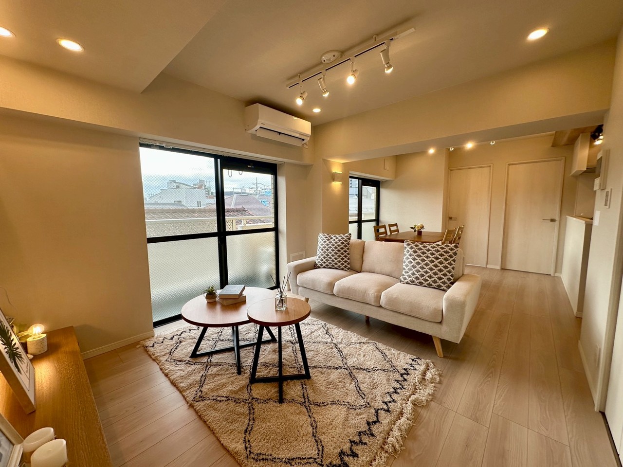 新耐震基準マンション、南向きの角部屋住戸、室内リノベーション住戸。家具・エアコン付き販売、安心のアフターサービス保証付き。