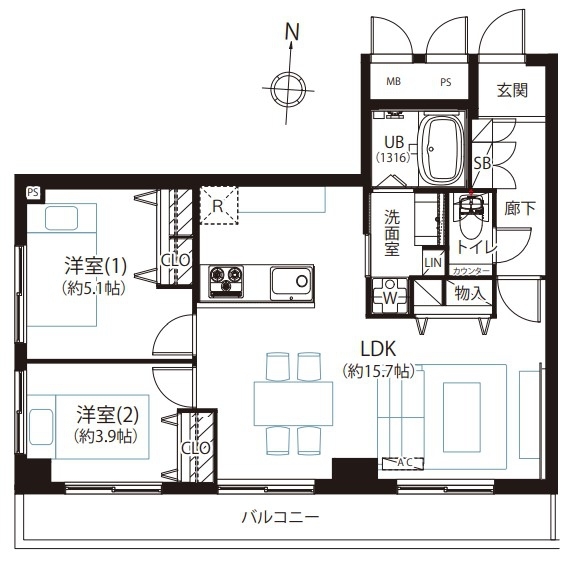 | 間取 | 2LDK (LDK15.7帖、洋室5.1帖、洋室3.9帖) | ||
