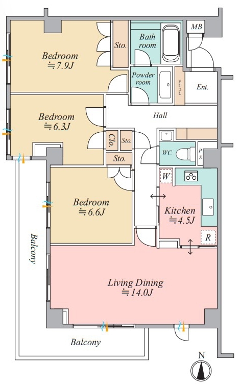 | 間取 | 3LDK (LD14.0帖、K4.5帖、洋室7.9帖、洋室6.3帖、洋室6.6帖) | ||