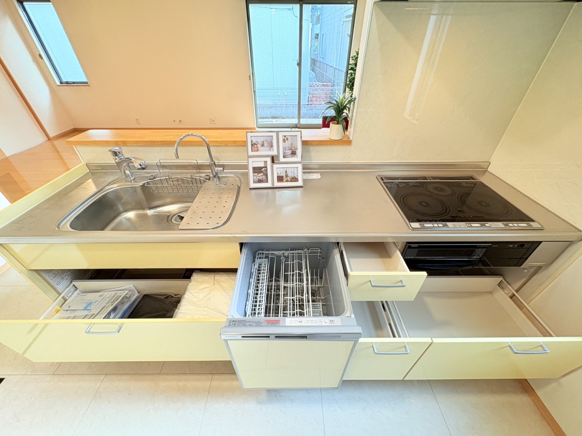 収納スライドをぐっと開けばお鍋や調味料をどんどんしまえる大収納。キッチンはいつもキレイ。