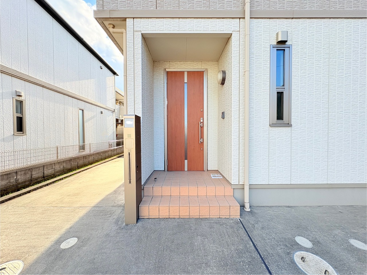 玄関ドアをあけてすぐの場所に配置された機能門柱。ポスト、表札が一点に集中しています。