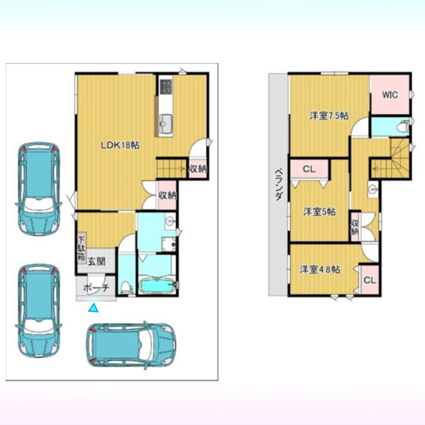 | 間取 | 3LDK (LDK18帖、洋室7.5帖、洋室5帖、洋室4.8帖) | ||