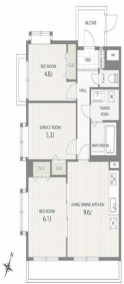 | 間取 | 2SLDK + アルコープ有面積2.52平米 (LDK9.6帖、S5.3帖、洋室6.1帖、洋室4.8帖) | ||