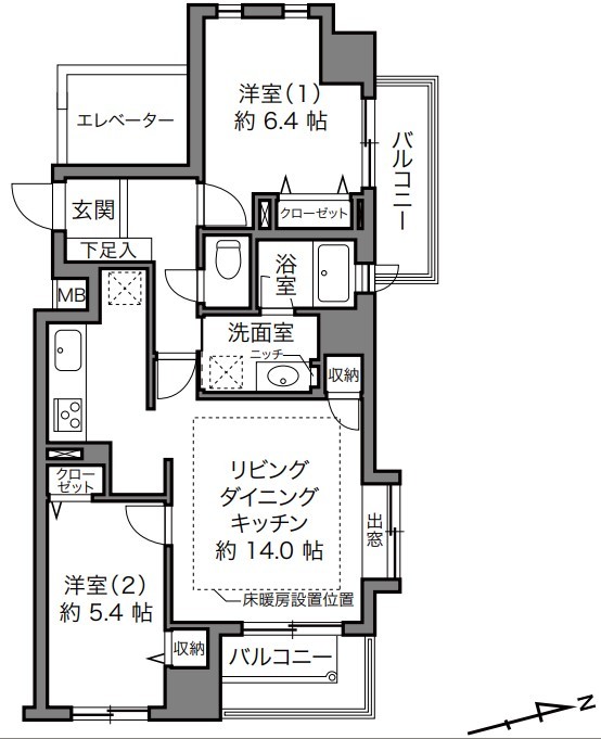 | 間取 | 2LDK (LDK14帖、洋室6.4帖、洋室5.4帖) | ||