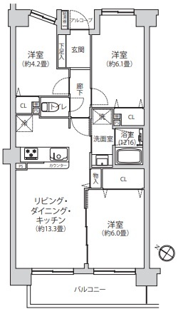 | 間取 | 3LDK (LDK13.3帖、洋室6.1帖、洋室6帖、洋室4.2帖) | ||
