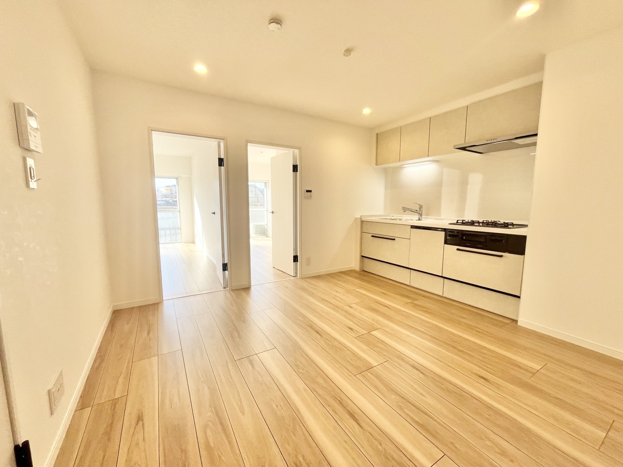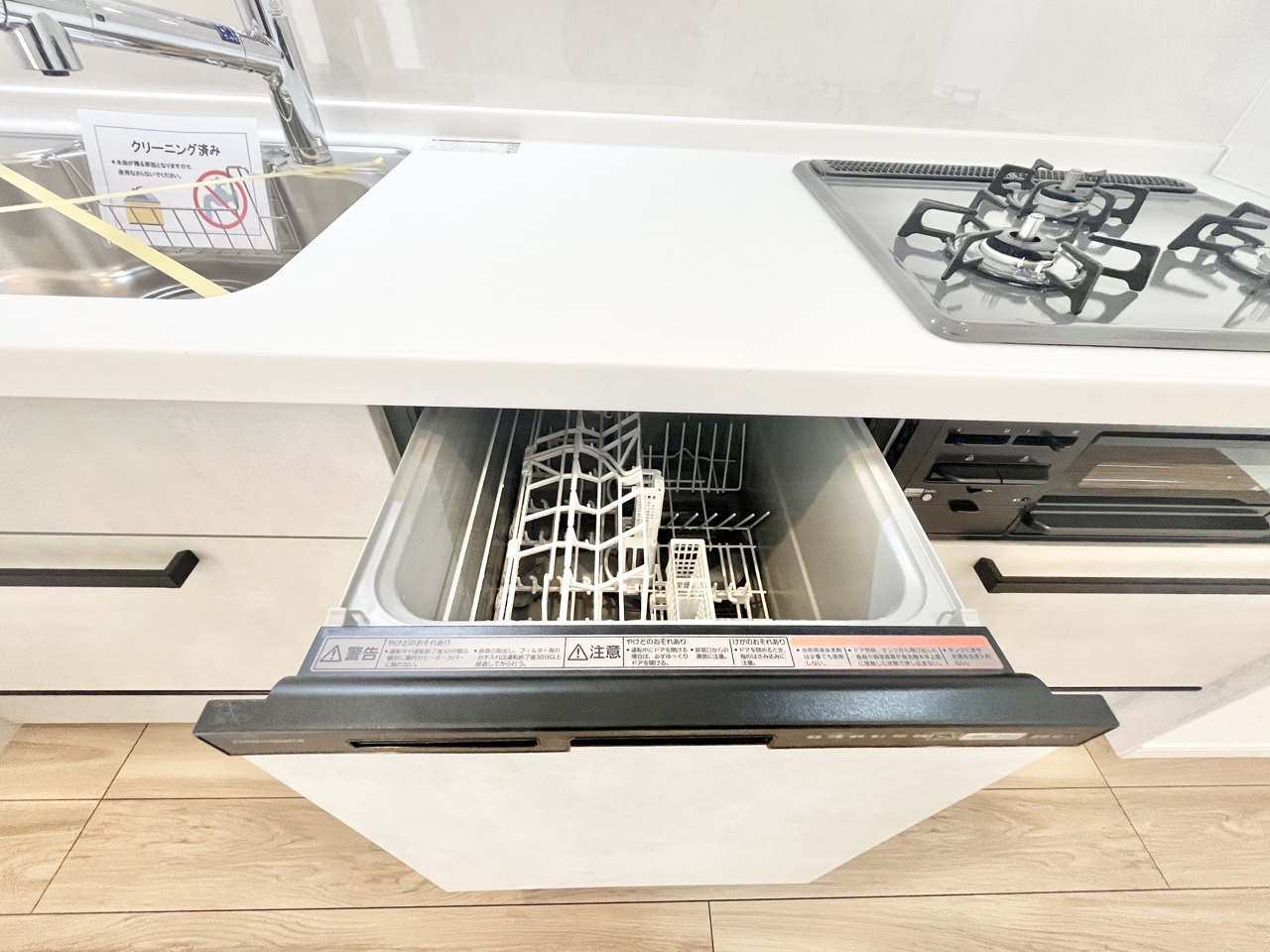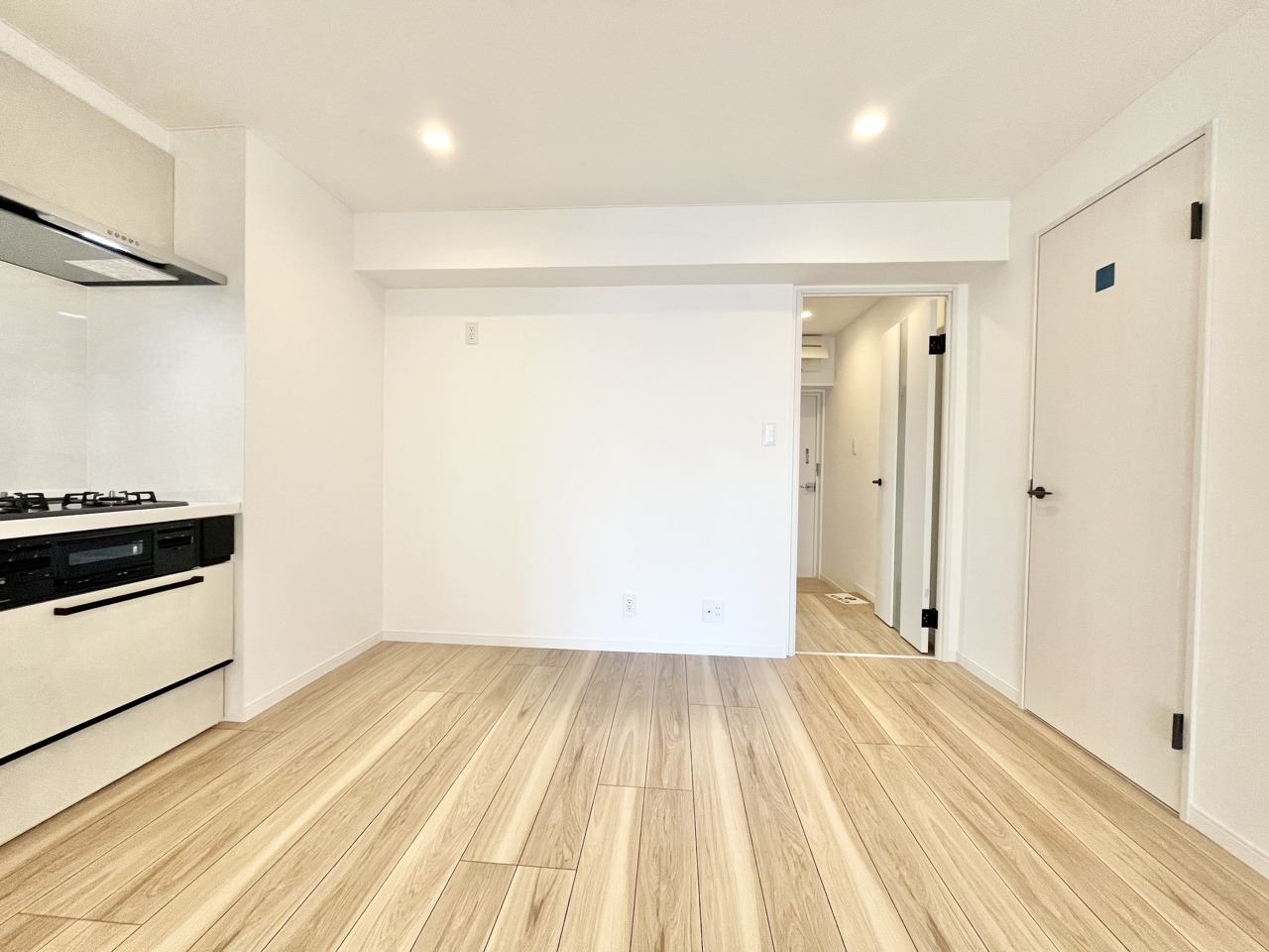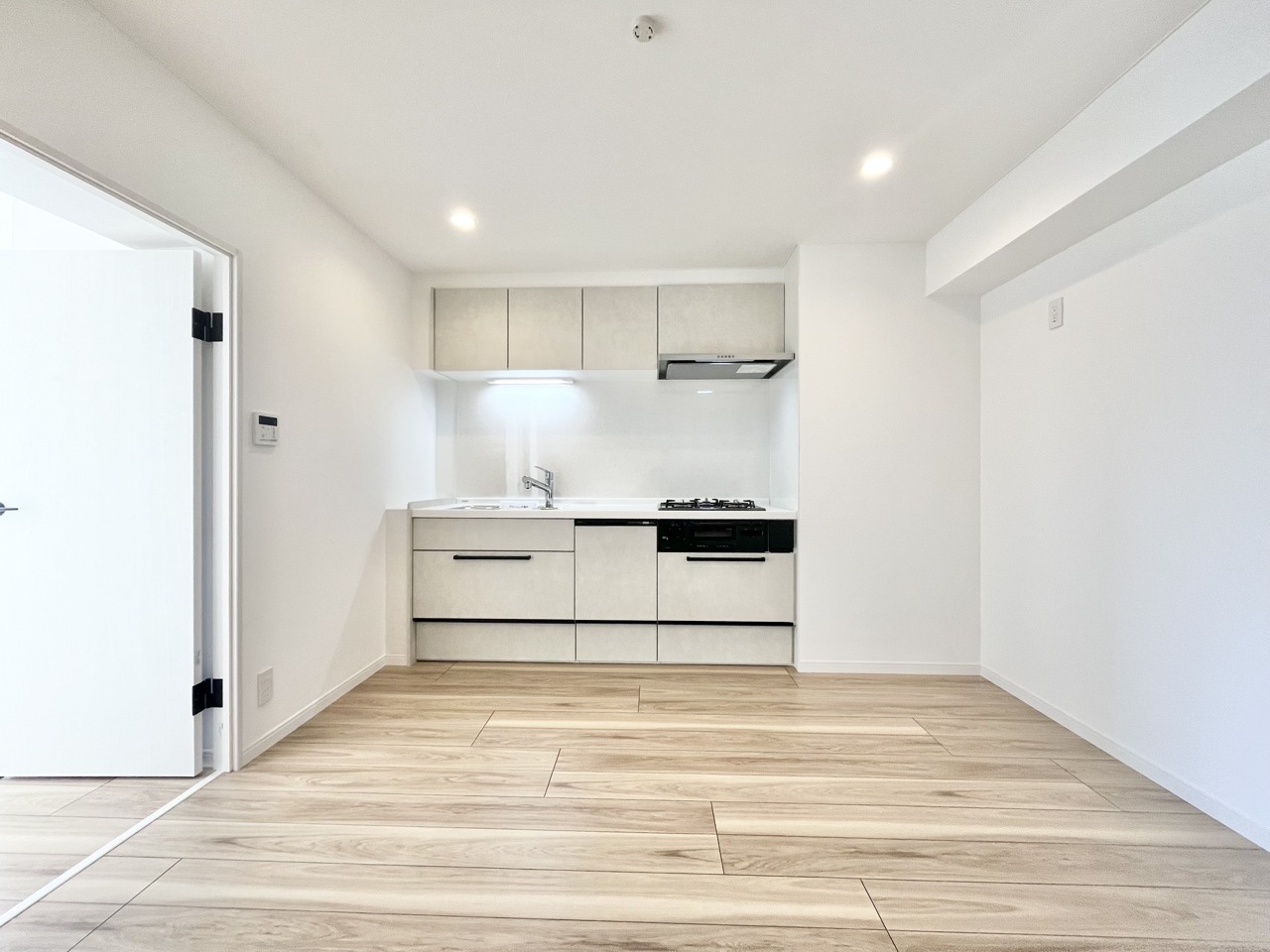 清潔感あふれる空間に、温かみのある木目調の床が心地よい広がりを感じさせます。