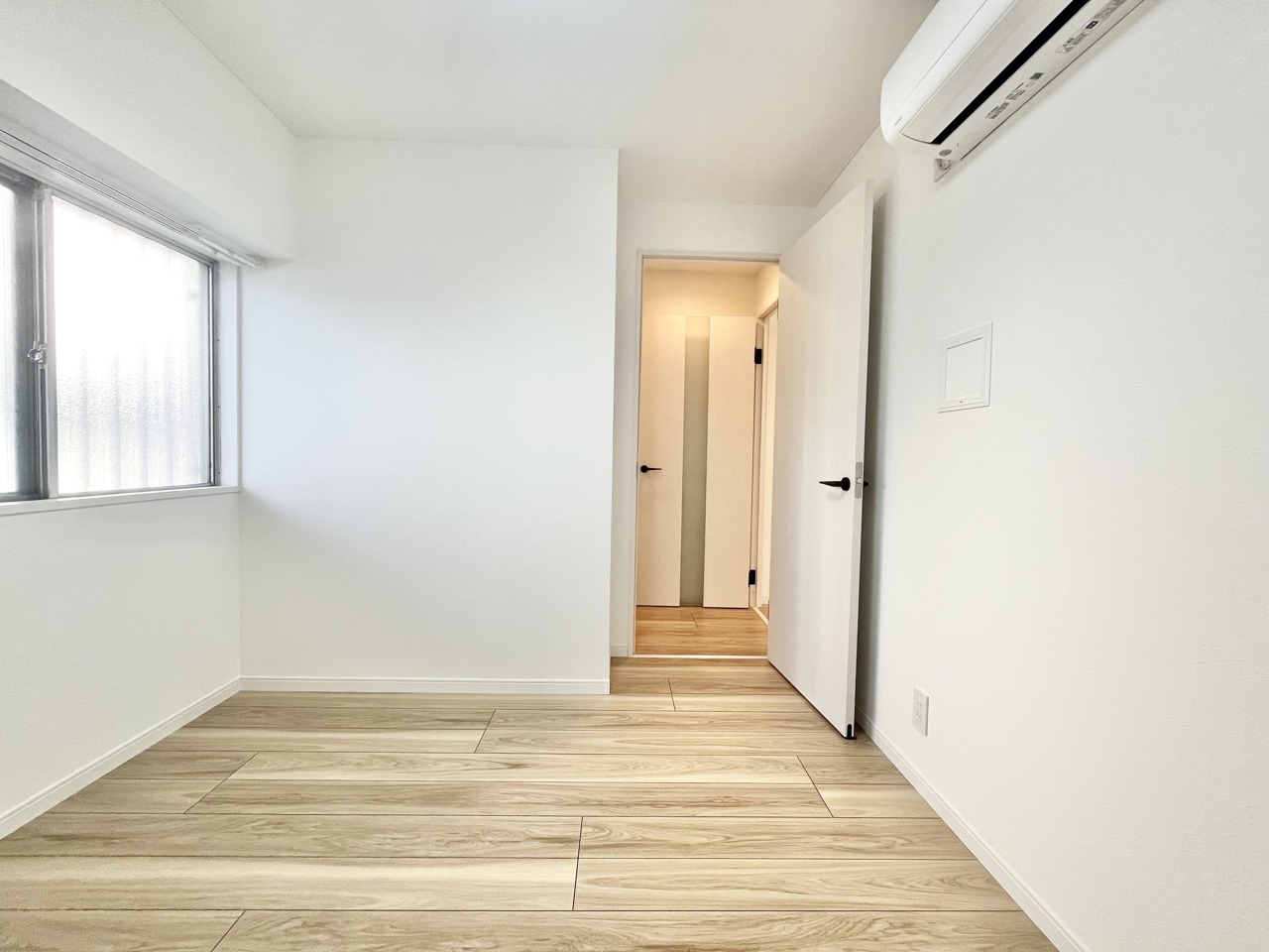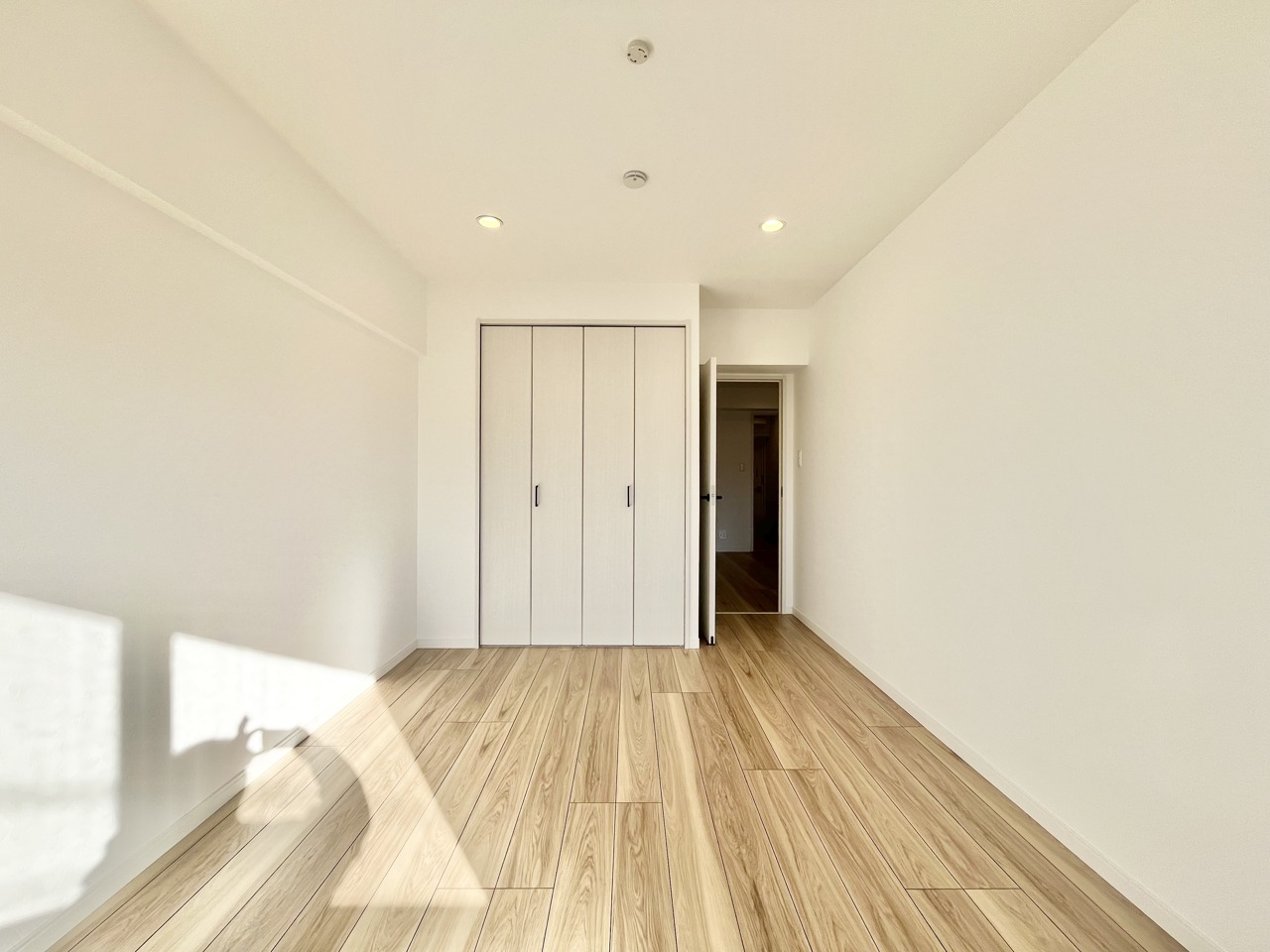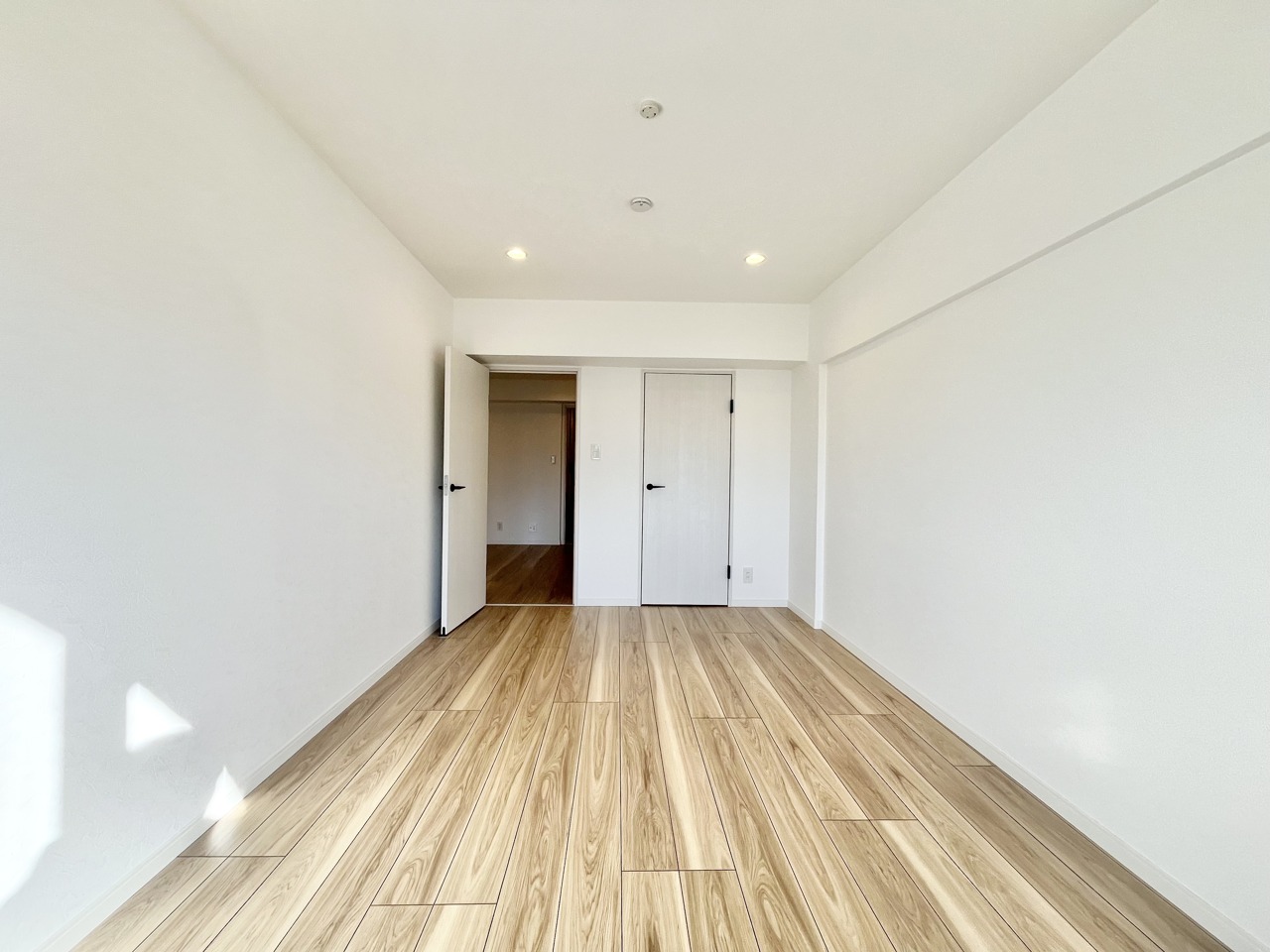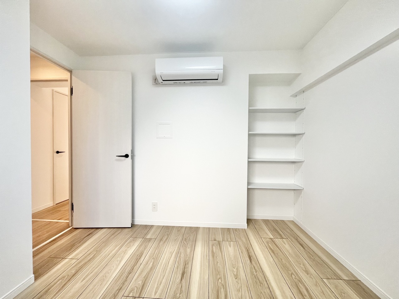 温もりある床材と白い壁が調和する、心地よい空間