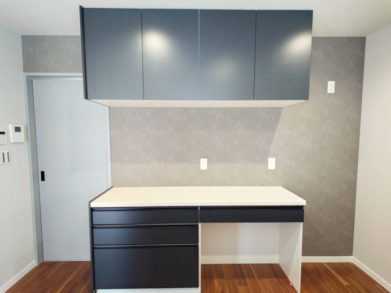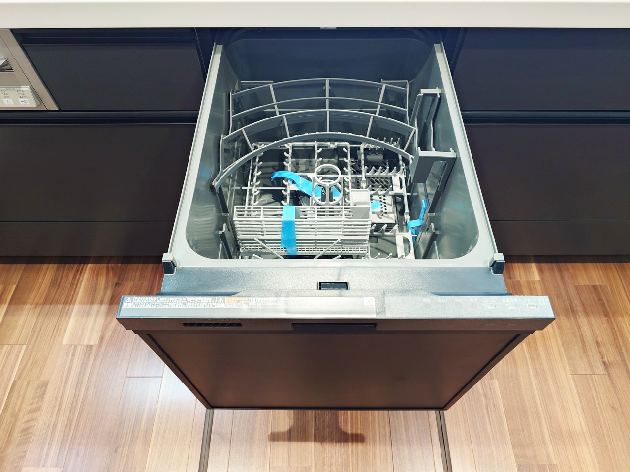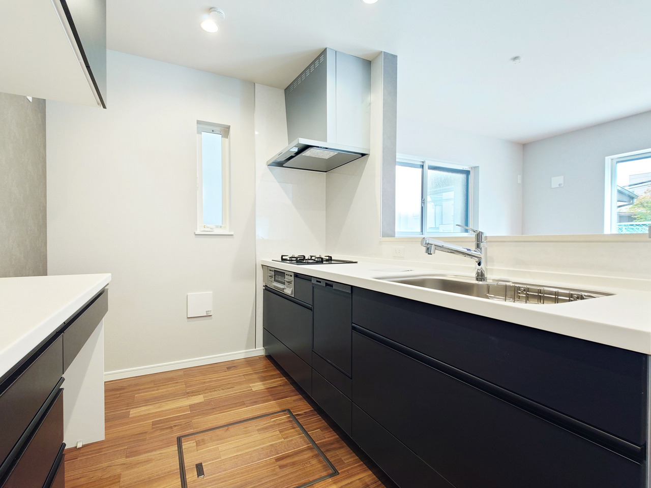 リビングにいる家族の顔が見渡せるカウンターキッチン。お料理もより一層おいしく、楽しく。食器棚を背面に設置しても十分な広さを確保しています。