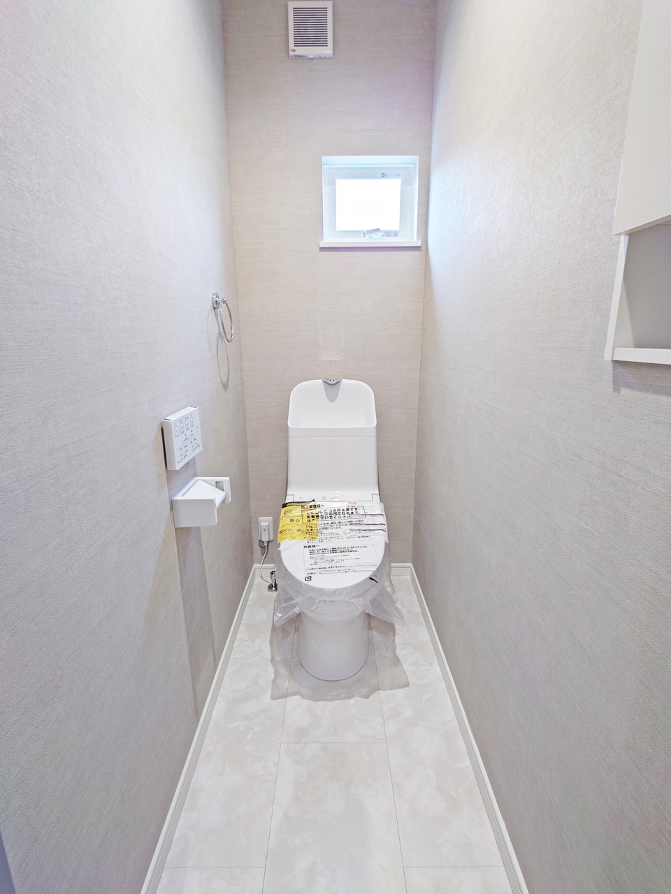 ウォシュレット機能付きのトイレ。換気のしやすい窓付きで、収納もあり実用性も兼ね備えた造り。