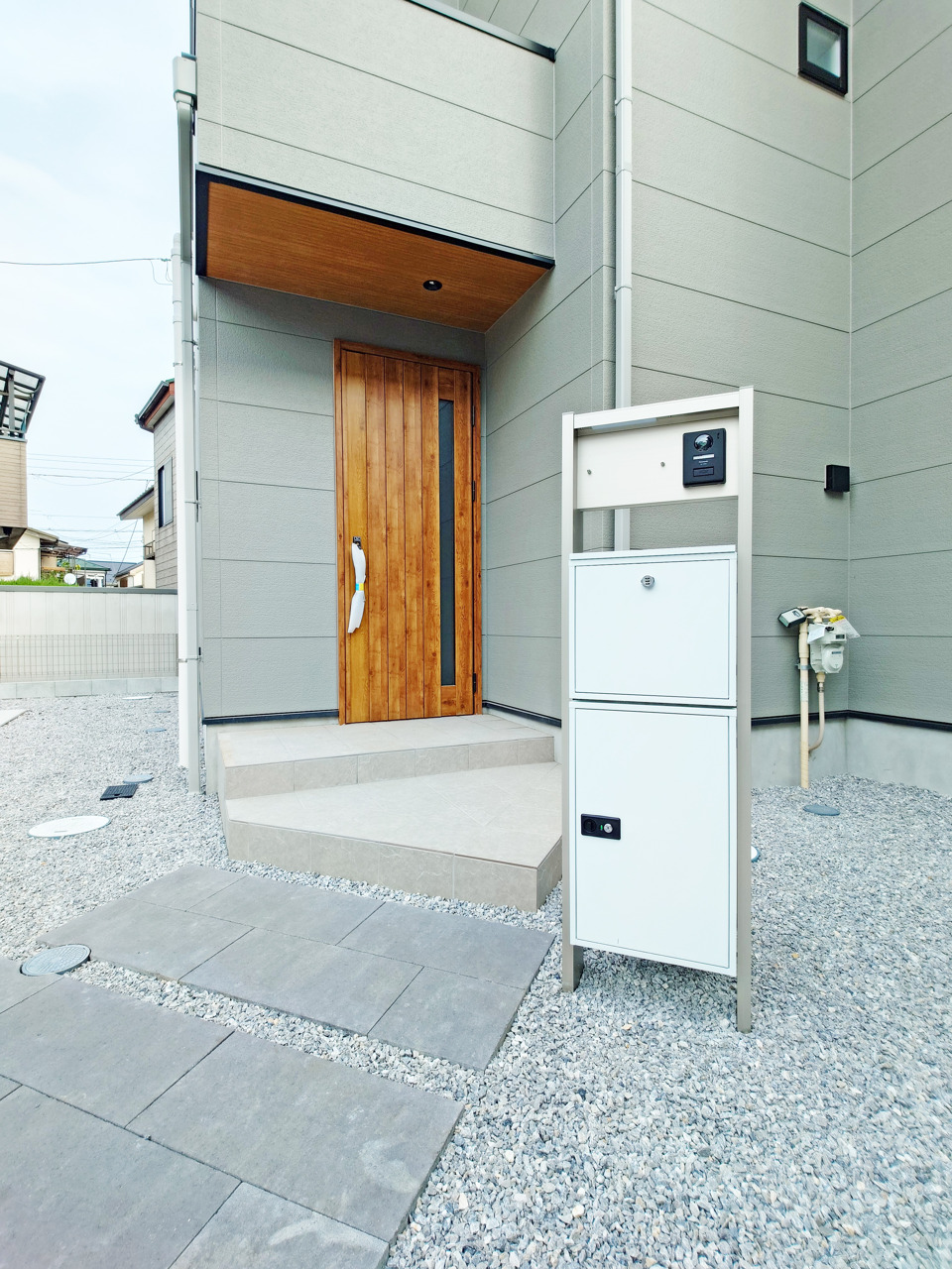 外出中で不在時や、在宅中でも手を離せない時に便利な宅配ボックス付きの門柱。