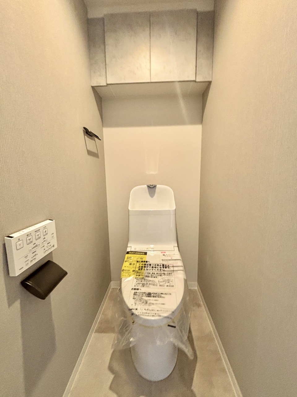 ウォシュレット機能付きのトイレ。収納もあり実用性も兼ね備えた造り。