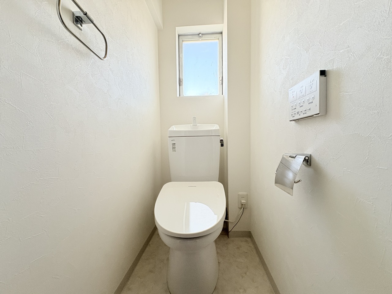 ウォシュレット機能付きのトイレ。換気のしやすい窓付きで、収納もあり実用性も兼ね備えた造り。