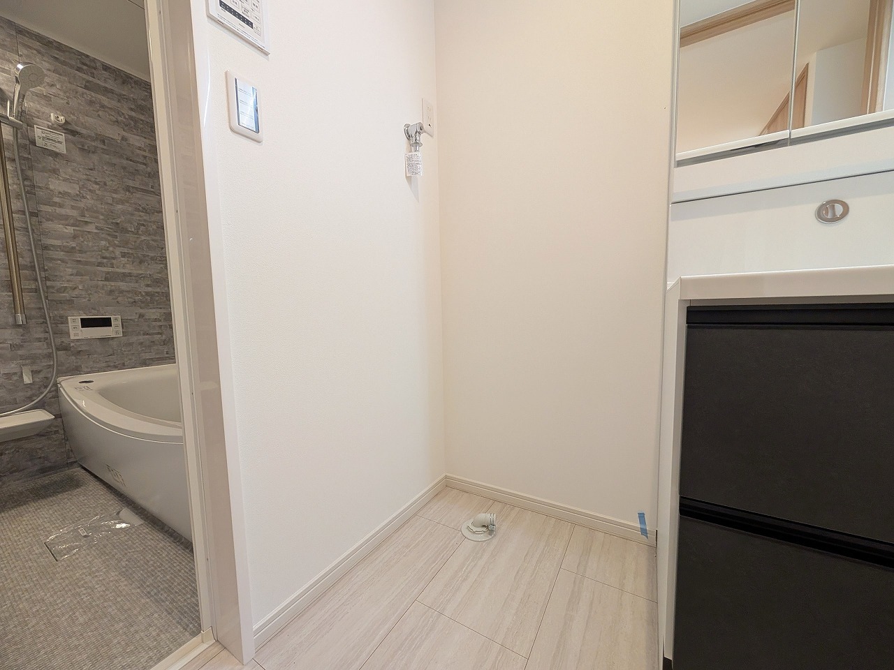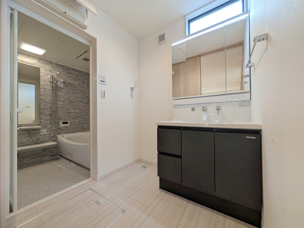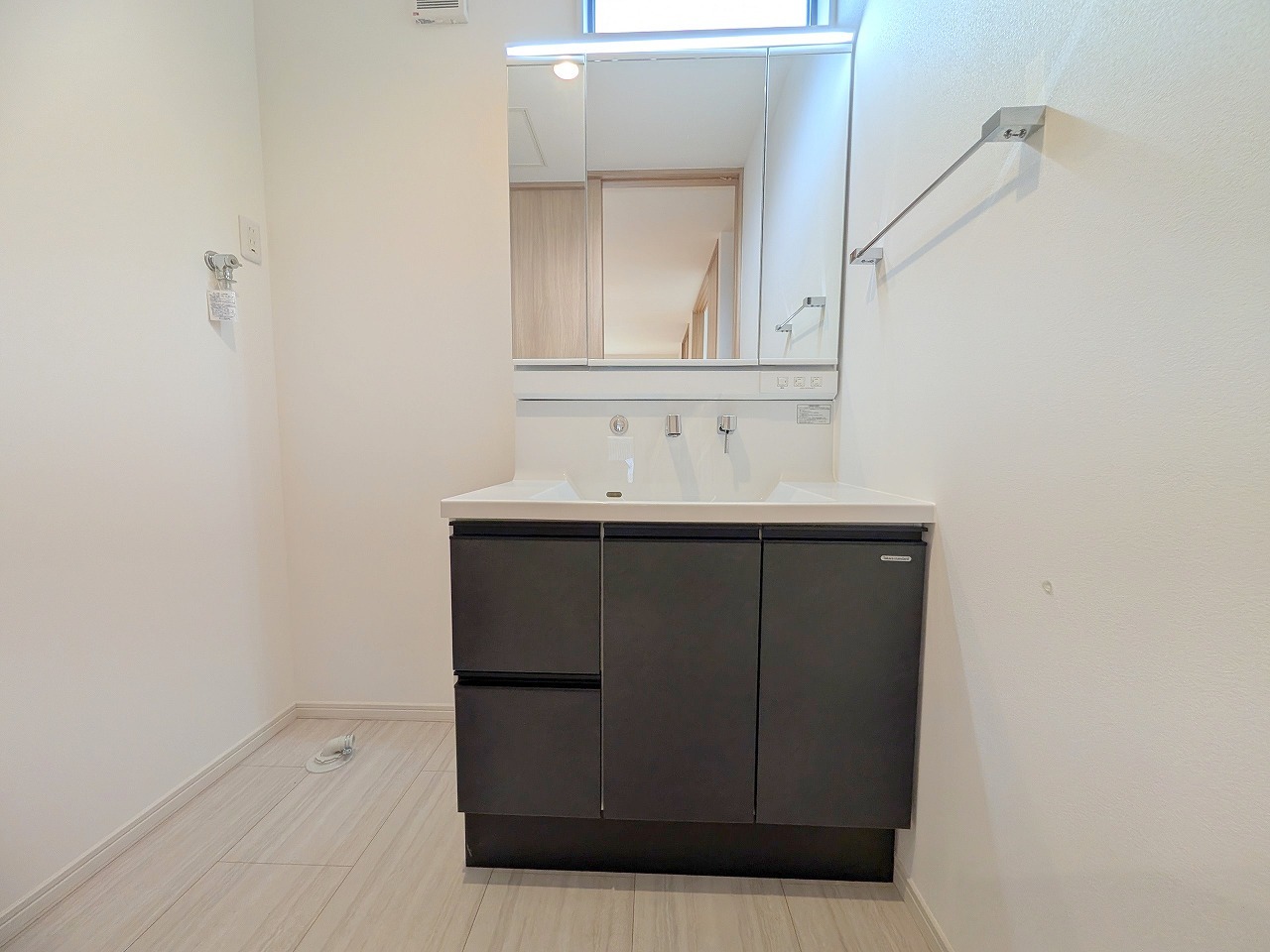 収納豊富な三面鏡付洗面化粧台。水回りのあれこれがキレイに収まりそうですね。