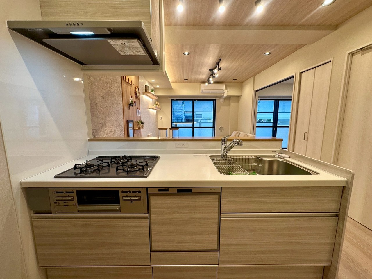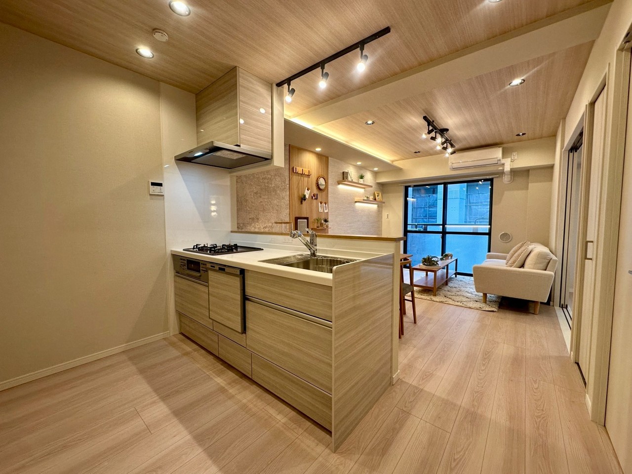 角部屋のリノベーション住戸、家具・エアコン付き、安心のアフターサービス保証付き。食洗器や浴室乾燥機など設備も充実。